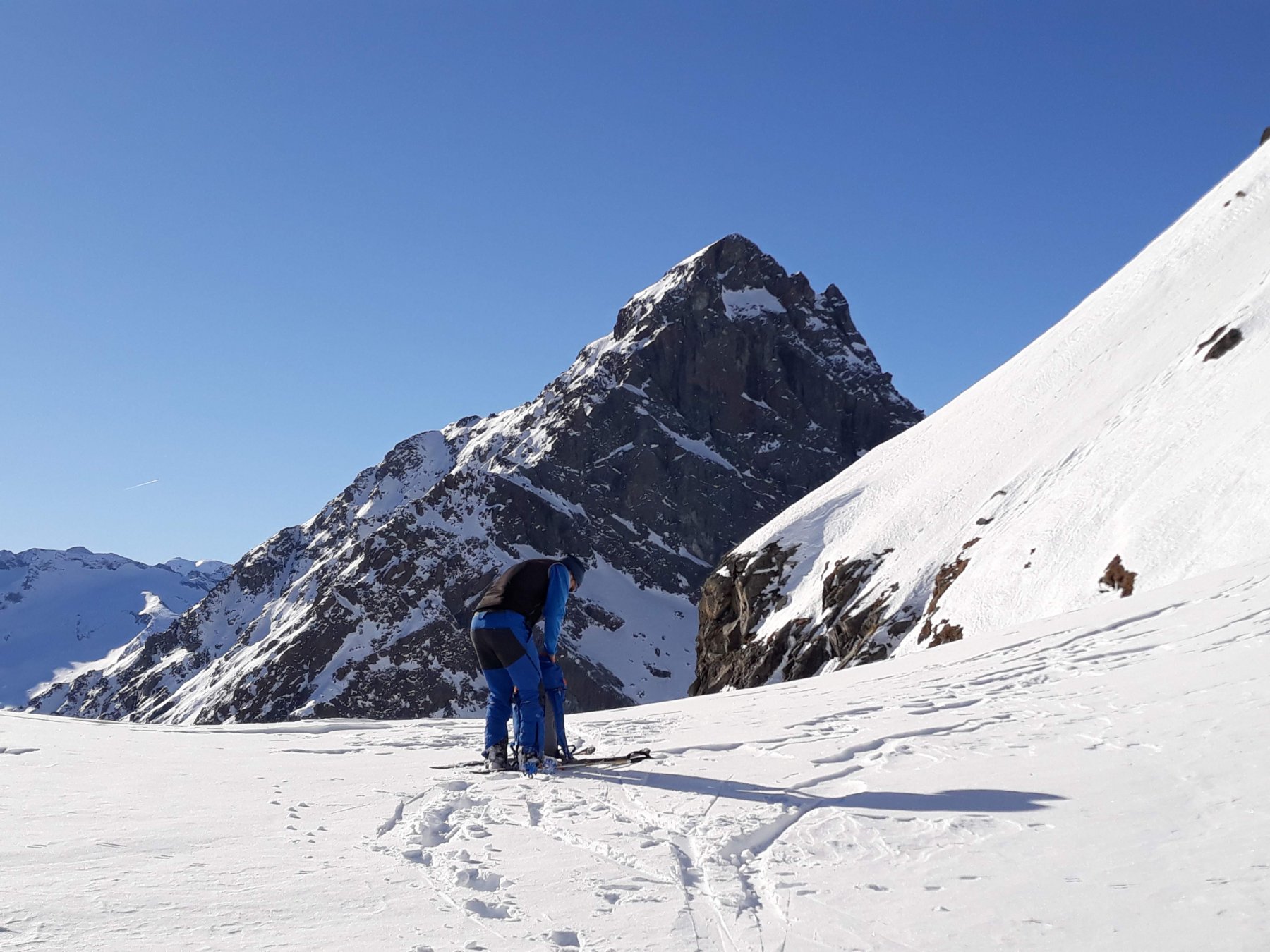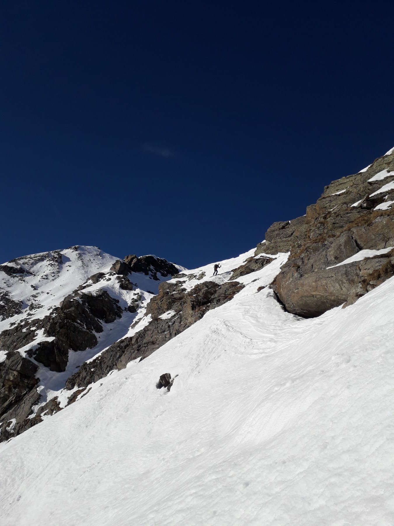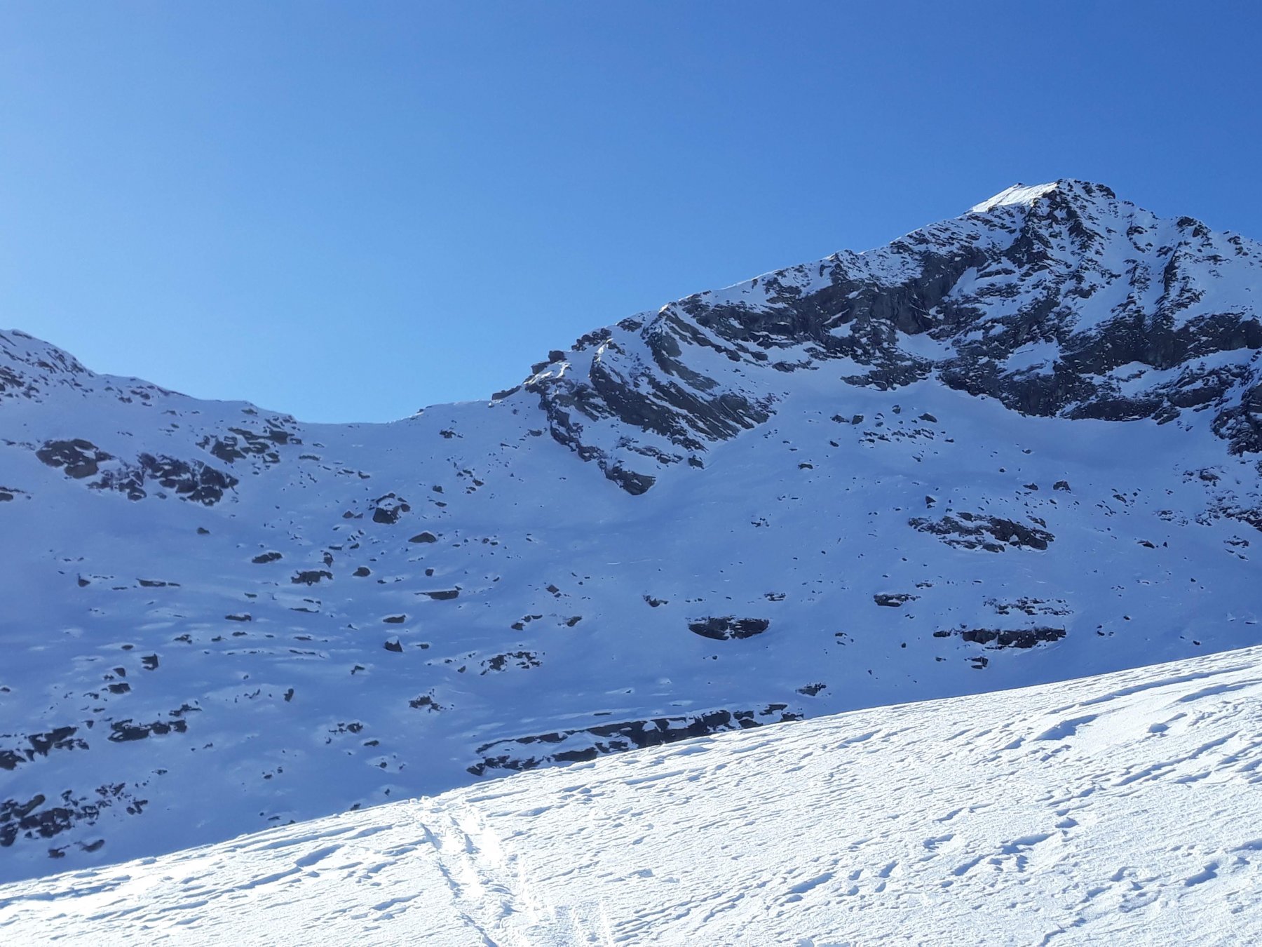Si scende un tratto traversando a una depressione sotto alle propaggini della Leitosa, poi si sciano i pendii tenendosi sempre verso destra fino a dover ripellare.