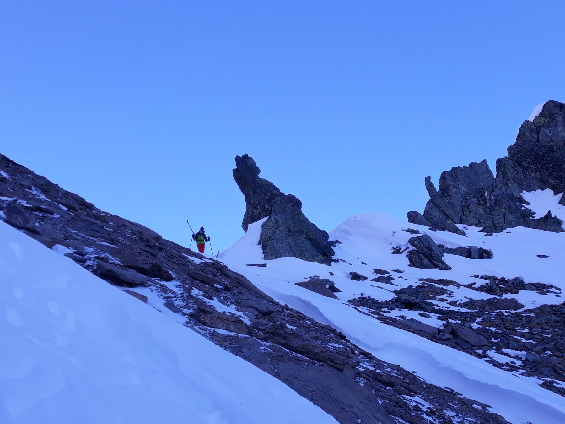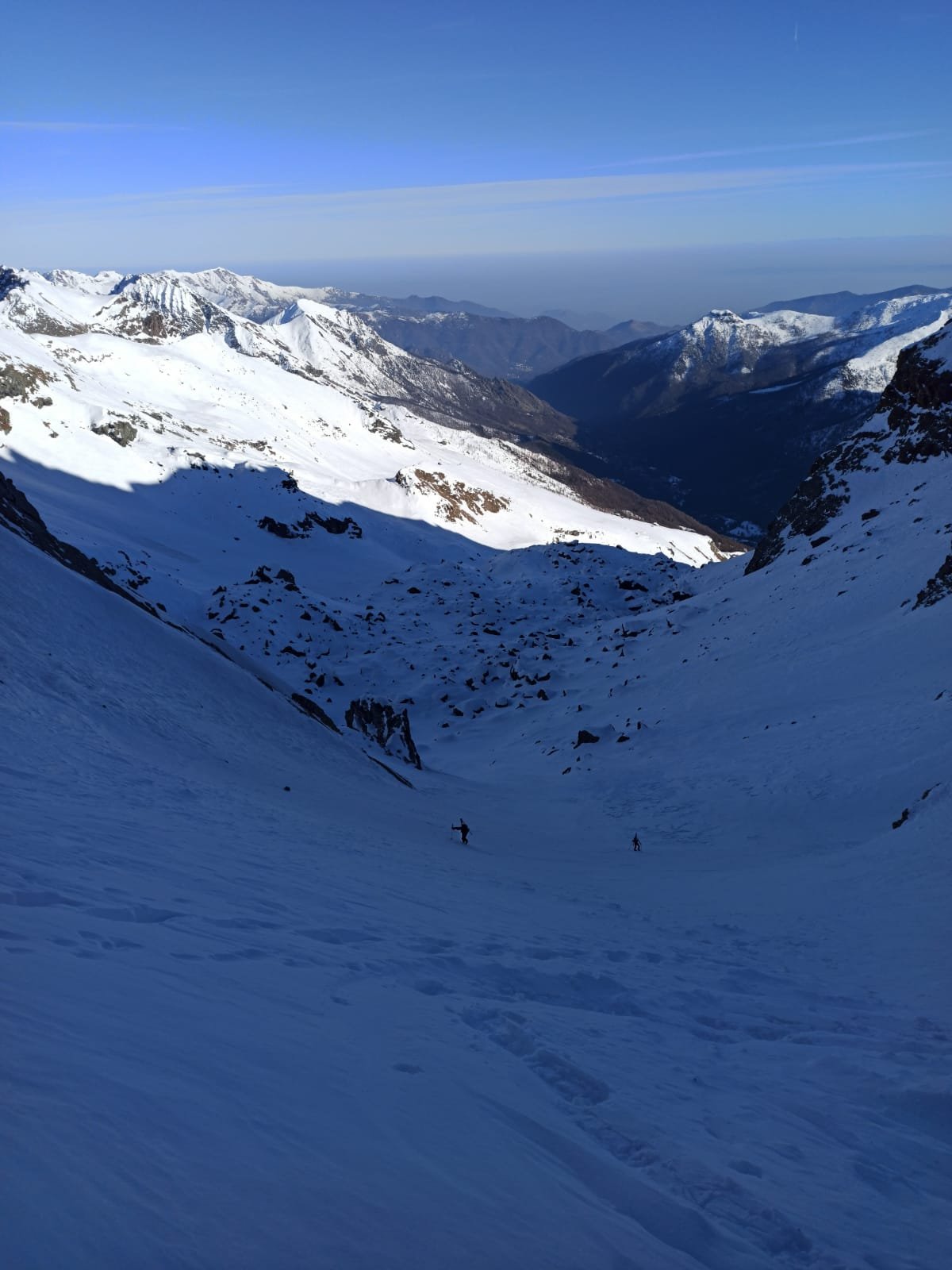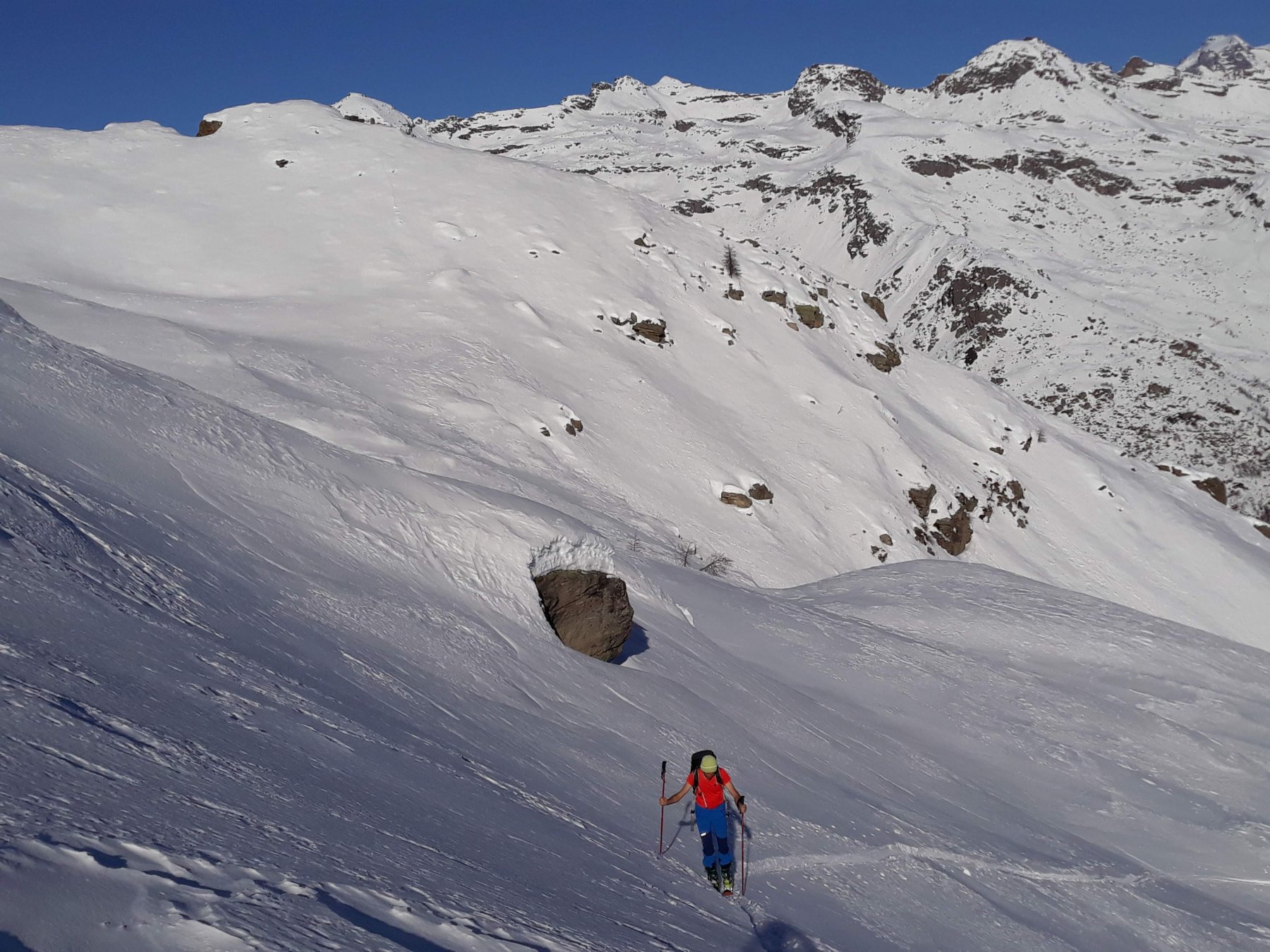 Si scende un tratto traversando a una depressione sotto alle propaggini della Leitosa, poi si sciano i pendii tenendosi sempre verso destra fino a dover ripellare.