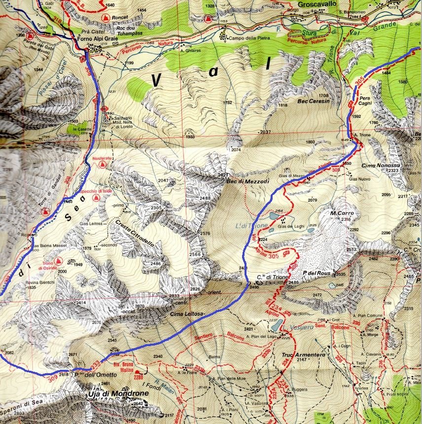 Da questo si scende tutto il vallone a nord dominato dagli Speroni di Sea fino sul fondo dell’omonimo vallone. Traversando verso valle si raggiunge prima l’alpeggio di Balma Massiet e poi, seguendo la sponda idr. sx la stradina che porta a Forno Alpi Graie.