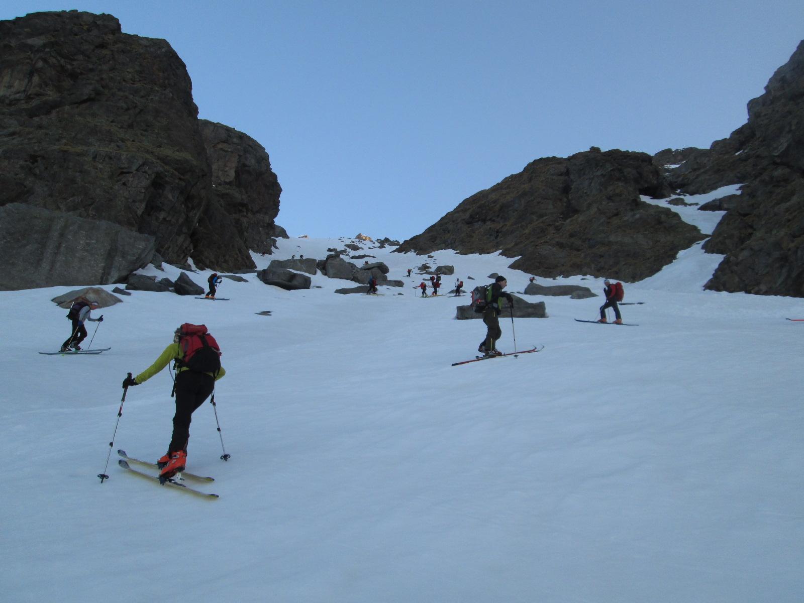 Seconda gita del we sociale del CAI Pianezza al Rif. Pontese. Partiti dal rifugio in 25 alle 6.15, buon rigelo notturno già in basso. Necessari i coltelli per il canalone sotto il Bivacco Carpano, lungo e in alcuni punti abbasta ripido. Giunti sul Ghiacciaio di Teleccio, alcuni hanno optato per il colle di Teleccio, in 12 abbiamo puntato verso la cima. Il breve ma ripido canalino si risale senza problemi sci a spalle, è ben gradinato e la neve è compatta ma non ghiacciata, al momento non servono i ramponi. Un po’ di attenzione nel traverso che porta al colletto sotto la cima, il pendio è abbastanza carico e conviene attraversarlo a piedi e tenendo le distanze. Arrivati al colletto, onde evitare di perdere tempo e compromettere la discesa, con un po’ di rammarico abbiamo rinunciato alla cima visto che la cresta che, sia pur breve e non difficile, avrebbe comunque richiesto almeno una mezz’ora tra salita e discesa.