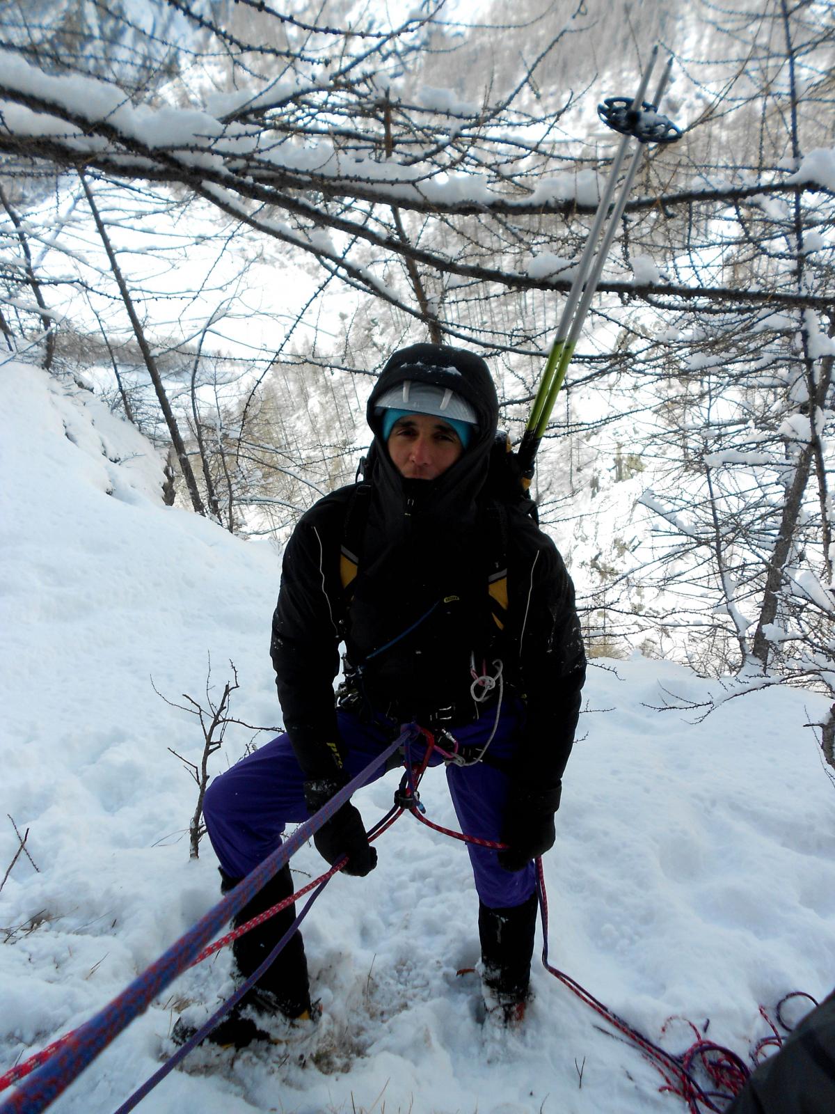 La nevicata di questa notte ha coperto un pò la linea, ma nulla di particolare, presenti 10 cm di neve fresca. Partiti con tempo nuvolo e una leggera nevicata. Temperatura al parcheggio -1. Nel pomeriggio è uscito il sole e vento tutto il giorno che continuava a far scaricare la neve appena posata. Anche se il ghiaccio si presenta buono la cascata è magra e poco proteggibile.
