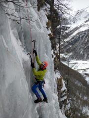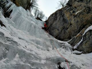 Cascata formata anche se non in piena forma. Primo tiro ghiaccio ottimo a sx, secondo abbastanza buono e terzo tiro molto buono ma con uscita magra. C’è un cordone su una pianta che aiuta a proteggere.
