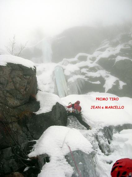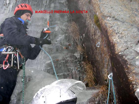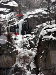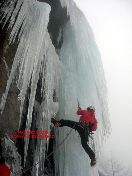 Secondo tiro colonna di 15 mt seguita da un corto muro a 80° per uscire dalla cascata. Puntare a sx ad un evidente larice attrezzato con cordoni e maillon per calata(S2).