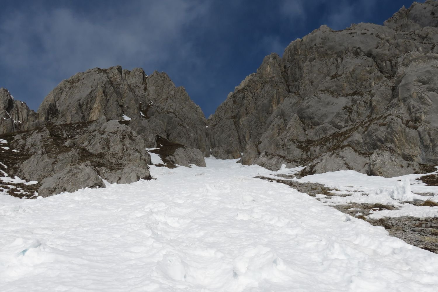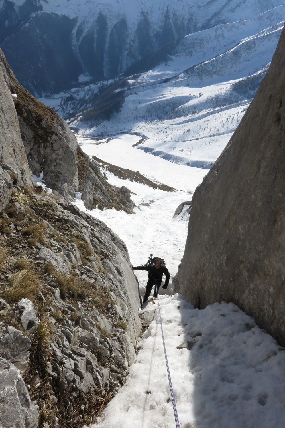 Materiale: corda da 25 sufficiente, piccozza e ramponi (due piccozze solo con lunghi tratti in ghiaccio).