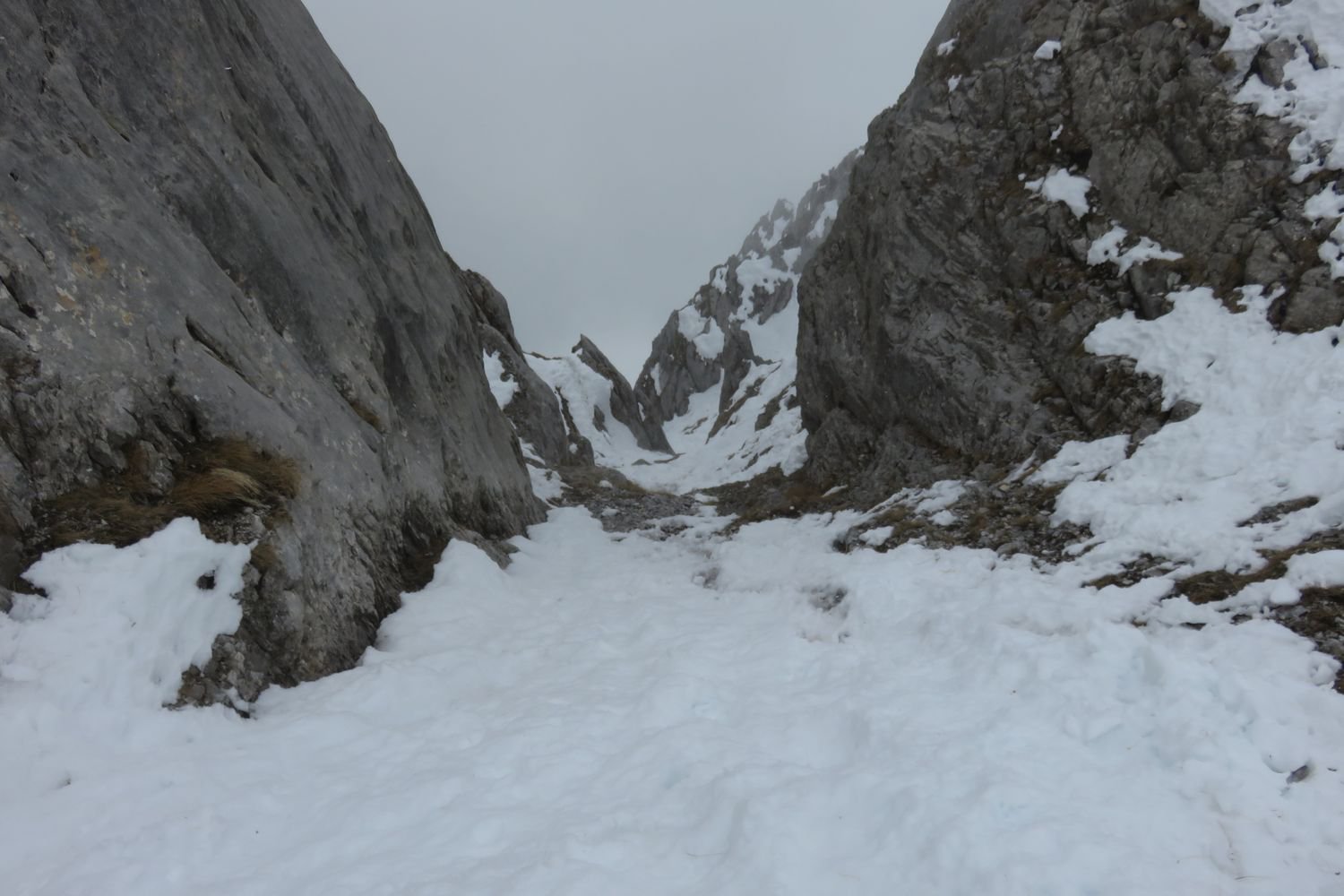 Dal park di Palanfrè salire verso il M. Pianard . A 2000 m circa, attraversare la comba e tagliare orizzontalmente verso dx (est) fino a raggiungere la conoide dell’evidente canale, già riconoscibile dal basso. Risalire la conoide e raggiungere la strettoia, larga non più di 1,5m per una ventina di metri. Superarla (ghiaccio, neve a 50°, misto delicato possibile – II/III grado – soprattutto in uscita). Sopra questo tratto il canale è nevoso e offre una salita più ordinaria su pendenze tranquille (40°, qualche salto facile di misto), fino a raggiungere la cresta Sud-Est a 2300 m circa, che si segue verso sx fino alla vetta.