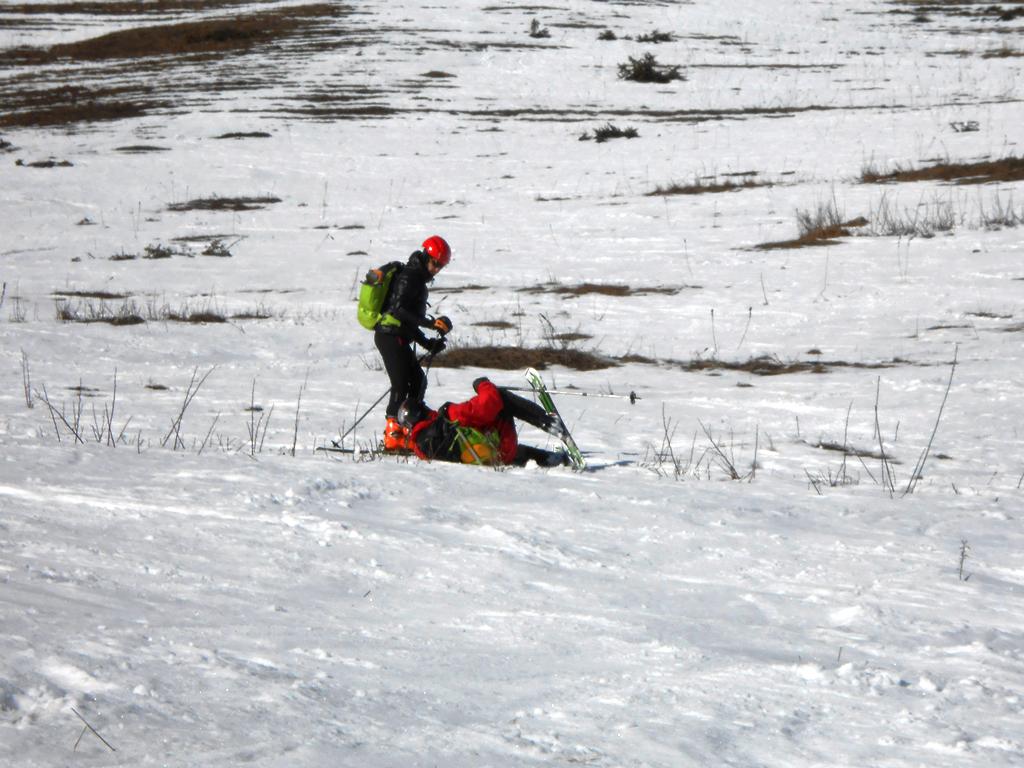 Saliti per il pendio del Bec dell’Omo e la spalla est, discesa diretta dalla cima per il canale sud-est/sud: neve dura ed irregolare nel primo tratto, poi quando il canale gira a sud ottima granita (probabilmente chi ci ha preceduto ha lisciato il pendio, grazie!) dopo di che le gobbosità aumentano parecchio. Tratto finale con neve al limite e assai dura (anche troppo…).