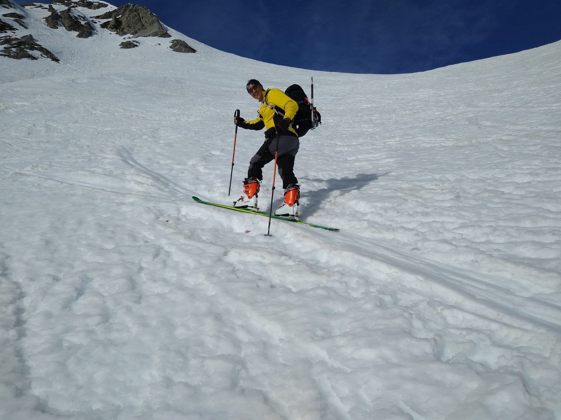 Folate di vento caldo già alla partenza da Palanfrè. Il caldo e il rigelo notturno pressoché assente ci ha permesso di risalire i ripidi pendii direzione Monte La Croce senza calzare i rampant. Solo neve un pò più dura dal Colletto sul traverso verso la vetta. Un leggero vento in quota ma non fastidioso. Prima parte di discesa dalla vetta su neve abbastanza lavorata dai passaggi precedenti con ingresso dalla cresta abbastanza da interpretare data la pendenza sostenuta. Poi dal colletto in giù neve primaverile molto divertente e sciabile per tutto il pendio sino all’attraversamento per ricongiungersi all’itinerario del Pianard. Questo tratto sarebbe stato da 5 stelle. Poi tratto di rientro ormai pistato sino al piazzale. Alle prossime