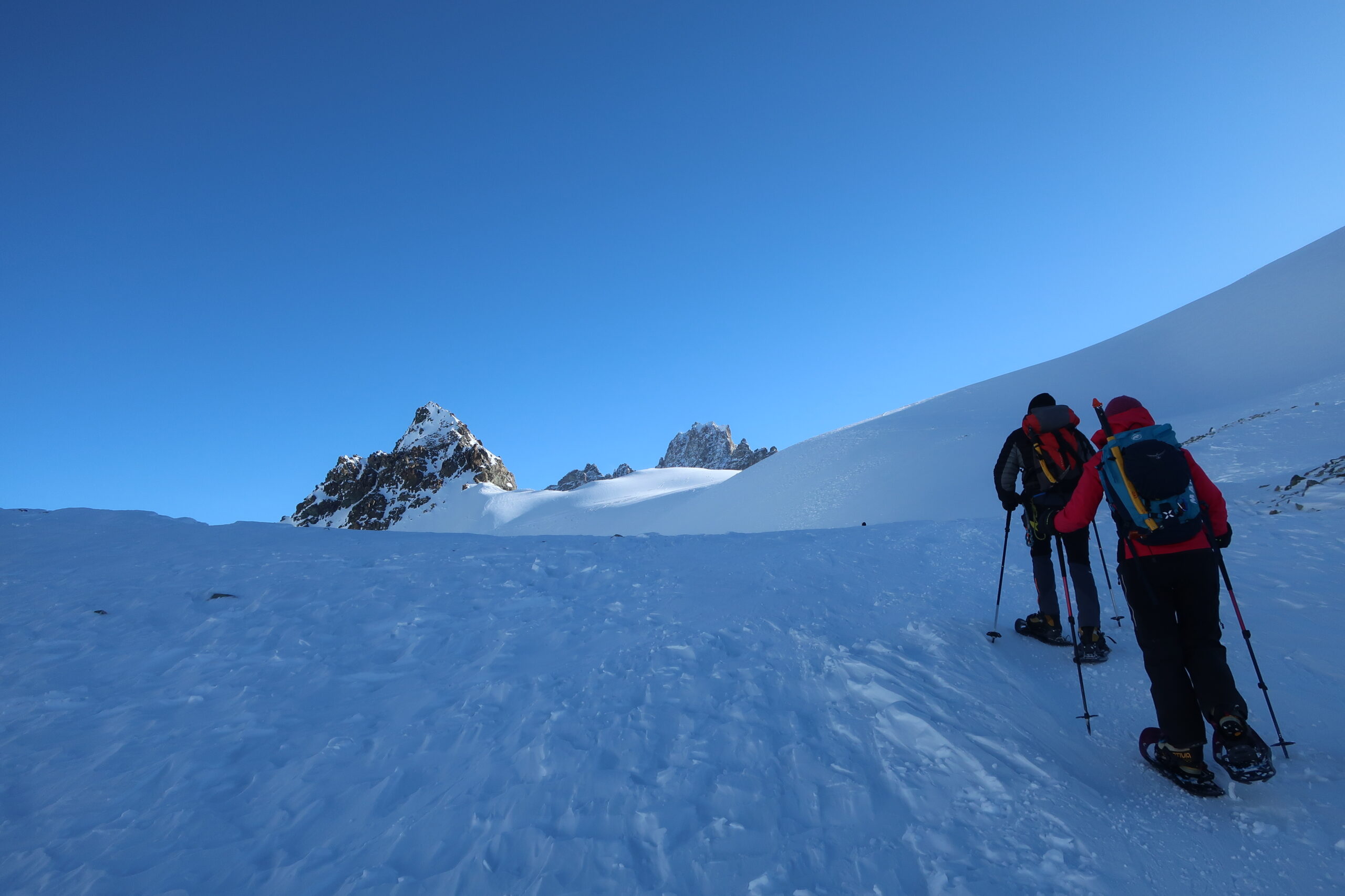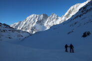 Per arrivare al rifugio Nacamuli (m2818) vi sono due possibilità: o si costeggia per circa 5km il lago su strada (innevata e battuta dai passaggi) raggiungendo La Lè (poco prima del rif Prarayer) e qui si imbocca a sx il vallone d’Oren, oppure si seguono le indicazioni del sentiero estivo che invece passa più in alto e si infila nel suddetto vallone all’altezza dell’Alpe d’Oren (m2161); la prima scelta è più lunga ma senza perdite di dislivello (adatta agli skialp), la seconda è più corta ma perde circa 50m. Imboccato il vallone lo si percorre sin quasi al fondo passando per lunghi pianori intervallati da rampe più ripide; a quota 2520m ci si infila in una valletta a dx già in vista del rifugio (tale valletta è a monte del percorso estivo) e la si risale assai ripidamente giungendo al pianoro sottostante il rifugio. Per svolte che bypassano piccoli salti rocciosi in breve si arriva al Nacamuli.
