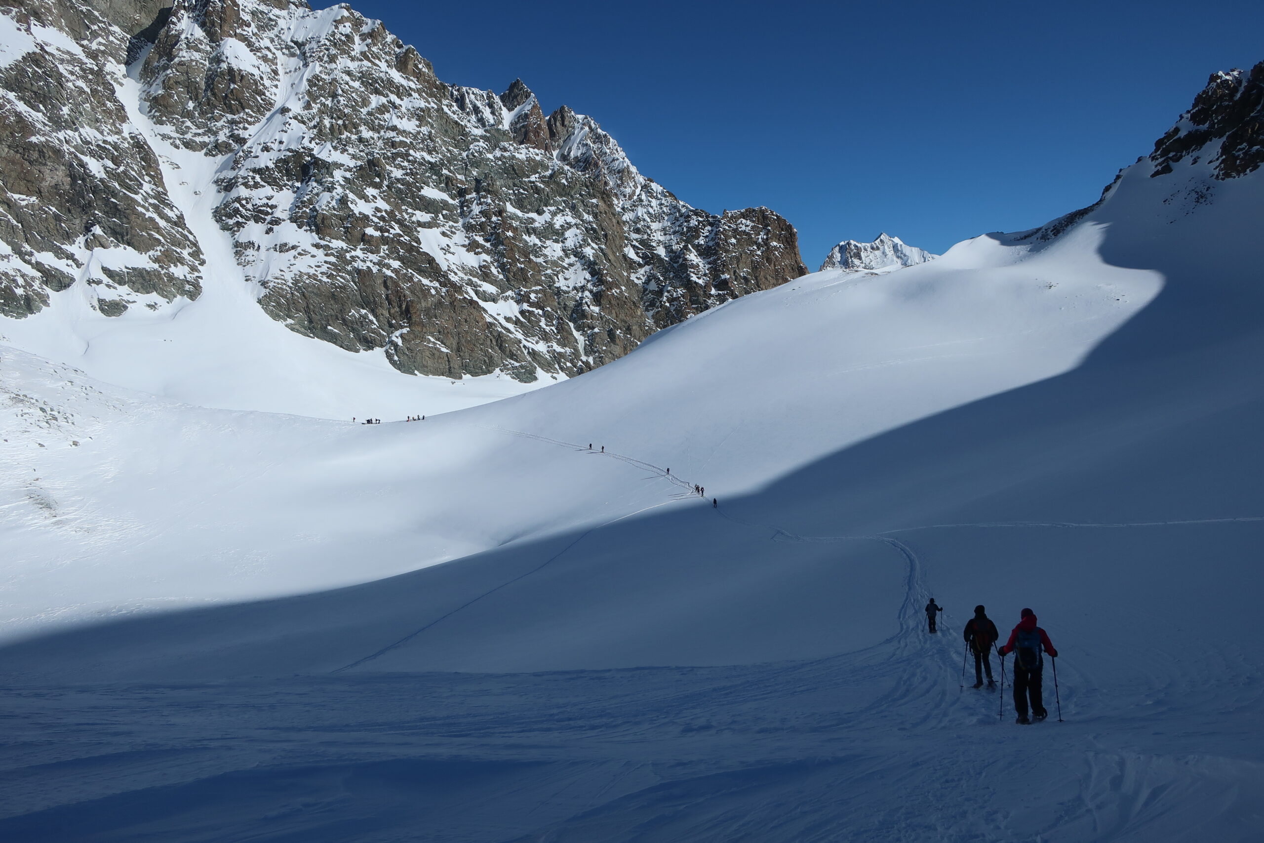 Il secondo giorno si raggiunge il Colle Collon (m3114) previa una perdita di dislivello nei pressi del rifugio e qui si piega in direzione ovest sino al raggiungimento del Colle dell’Eveque (m3390); da questo secondo colle si punta alla vicina Becca d’Oren raggiungendo il suo pendio sud-est nel suo lato sx (vicino alla cresta est-sudest) e lo si risale brevemente sbucando praticamente in cima; quest’ultimo tratto è il più ripido.