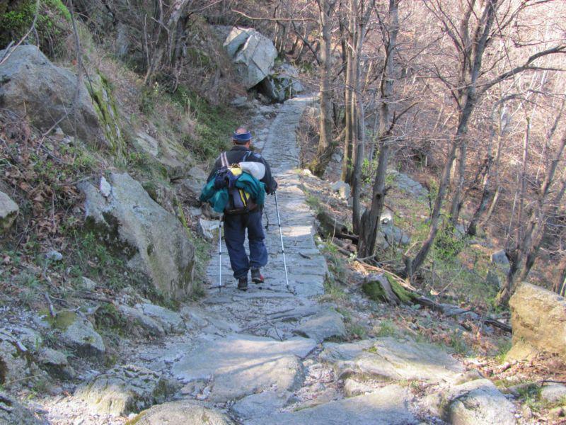 Dal lungo lago di Mergozzo si entra nel centro storico seguendo un segnavia escursionistico, a cui purtroppo non ne seguono altri. Si arriva quini in fondo a questo primo vicolo, si sale una scalinata a sinistra, si ridiscende leggermente e qui si trova una nuova indicazione che fa risalile a destra