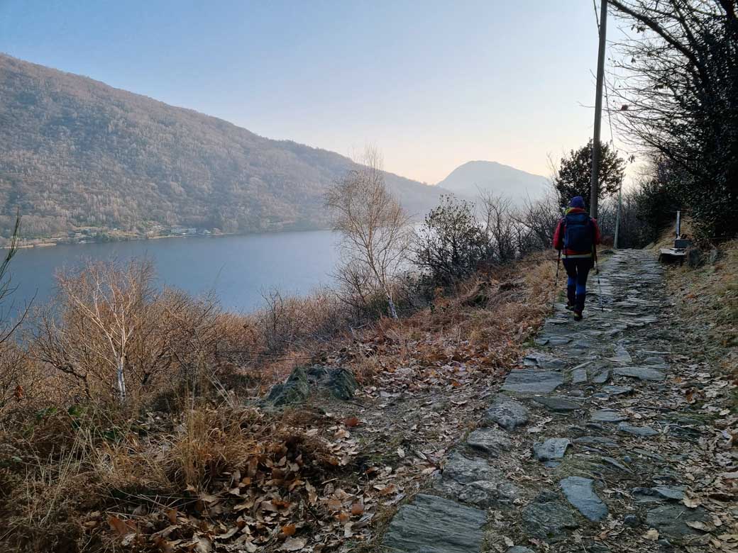 Da qui si imbocca la strada asfaltata in discesa e al primo tornante la si abbandona per il sentiero che, a picco sul lago di Mergozzo, riporta al punto di partenza.