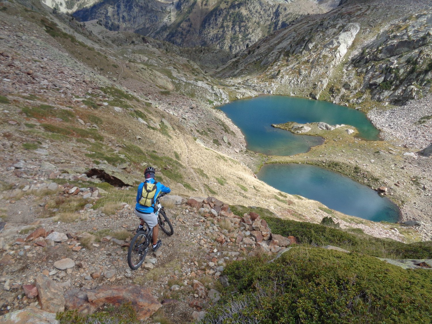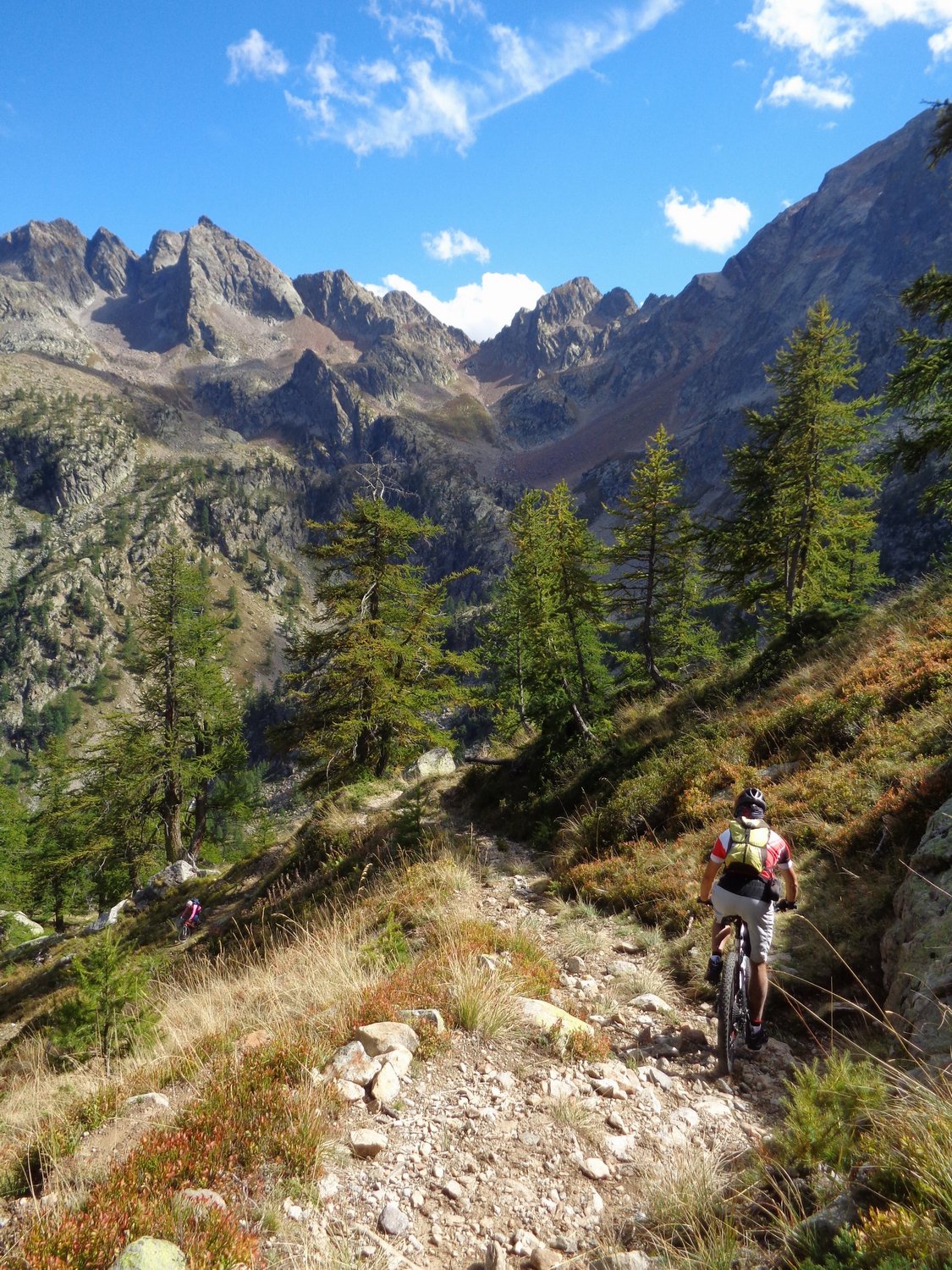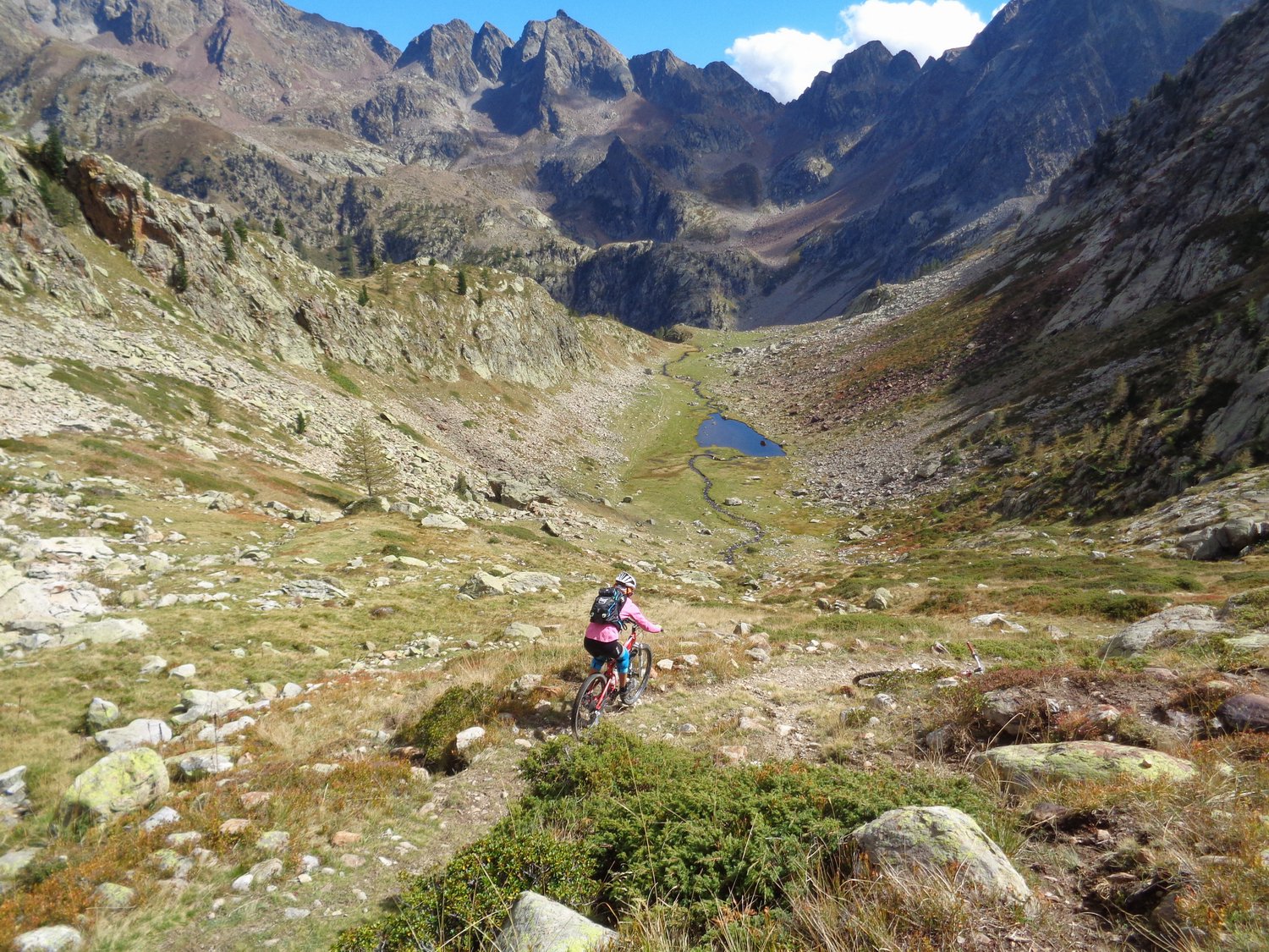 Scendete giù, abbastanza in sella, bordeggiando a sinistra i laghi della Valletta 2291 m, scenderete qualche volta su tratti brutti ed esposti e raggiungerete, già con un pezzo di sterrata, il Rifugio Malinvern 1839 m, e poi giù con quasi 15km di sterrata e asfalto per il vallone di Riofreddo, fino a Pratolungo quindi Vinadio.
