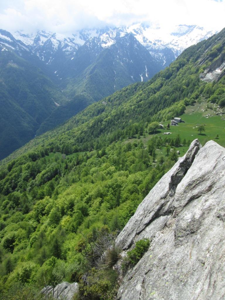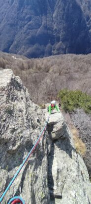 L4: 4b Salire lo spigolo su buone maniglie (3c),spostarsi verso un secondo spigolo molto aereo che si sale sul filo con alcuni passaggi più delicati (4b);un traverso orizzontale porta alla sosta.