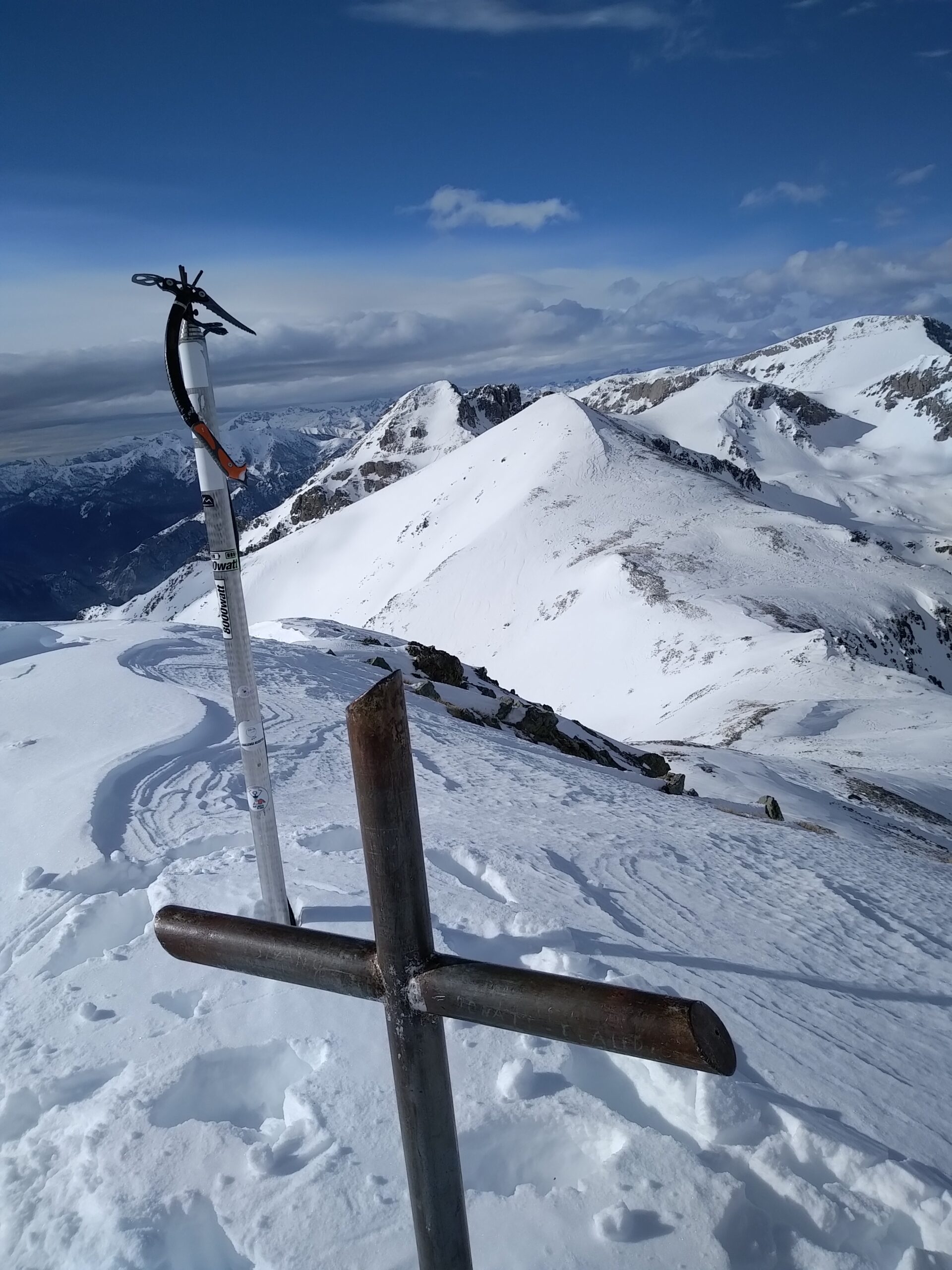 Condizioni ottime,neve trasformata e portante su tutto il percorso. Arrivati al “bellissimo” ripetitore siamo saliti dallo stretto canalino a est dove una corda fissa aiuta nella progressione (ripido con neve,35° circa) poi per una breve cresta alla vetta. Scesi dal versante sud-ovest abbiamo poi tagliato il versante sud ricollegandoci al sentiero che sale da Quarzina,infine passando sotto il rifugio Valcaira siamo tornati sulle tracce della salita. Tempo salita 4ore e mezza,3ore e mezza x la discesa,passo tranquillo.