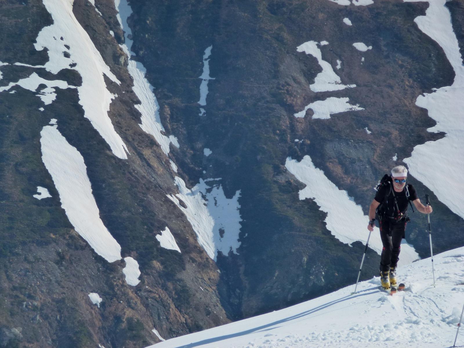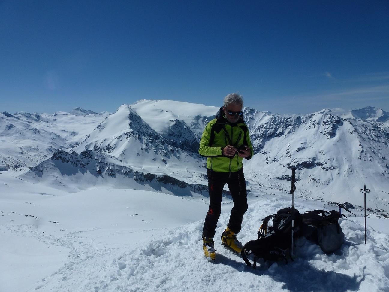 tantissima gente oggi, giornata bellissima si calzano gli sci subito dopo il ponticello,ottima traccia da ldeposito sci alla cima,la parte alta neve con tratti di fresca poi primaverile, molto divertente la discesa, grazie a Giordano che mi ha assecondato, aveva in programma la Luseney o la Tos, per la seconda abbiamo rinunciato per troppo portage.