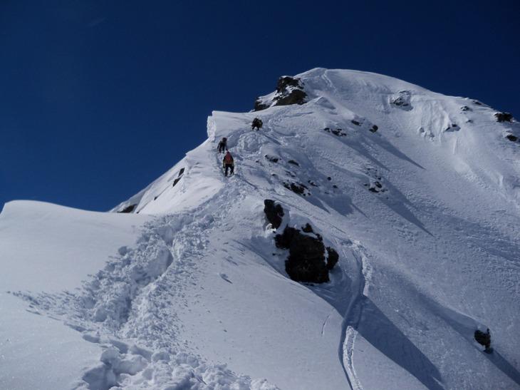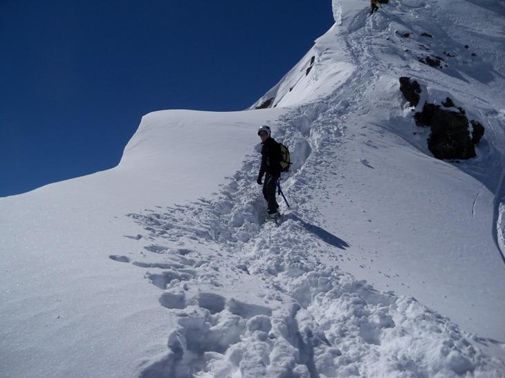 Partiti quando ormai la strada era piena di auto e scesi tardi fra gli ultimi (12.15). Quindici minuti di portage poi dopo il ponte neve continua. Utili ma non necessari i rampant. Salita sotto un sole torrido fino a 3000m circa, poi aria fredda fino in vetta. Anche se ben scalinata, la cresta io senza ramponi non la farei. Utile anche la picca. Vista l’ora temevamo di fare una discesa tristissima ma invece l’aria in alto ha mantenuto il ripido pendio sotto lo spiazzo in cui si posano gli sci con ottima neve polverosa (leggermente umida), il caldo nel frattempo in basso ha cotto quelle due dita di neve fresca cadute nella notte regalandoci una discesa eccezionale. Con un traverso un po’ più alto del fondo valle si arriva quasi al ponte senza spingere. Se non era proprio da cinque stelle… “ci somigliava bene” (citando Ligabue).