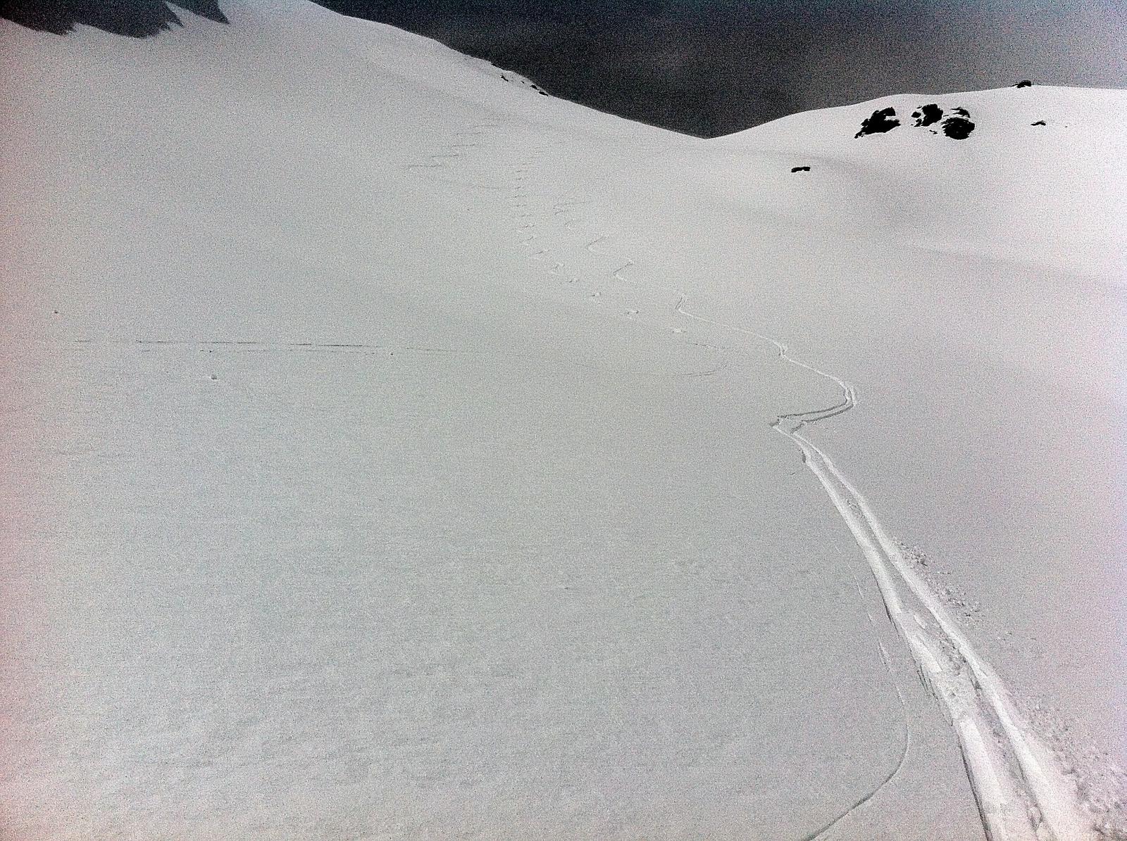 Proprio negli ultimi metri prima del piano ho staccato una slavinetta che mi ha trascinato per meno di venti metri, nonostante l’aspetto innocuo a vedersi posso assicurare che la sensazione è stata orribile.