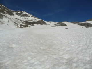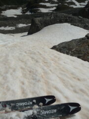 Portati gli sci in salita fino ai ripiani superiori saledno con i ramponi per lingue di neve. In discesa con qualche metti leva si arriva ancora 200m circa sopra la macchina. Salito in vetta dal deposito sci su sfasciumi e direi che quando c’è la neve è decisamente meglio. Discesa su neve ‘estiva’ sempre portante e abbastanza liscia.