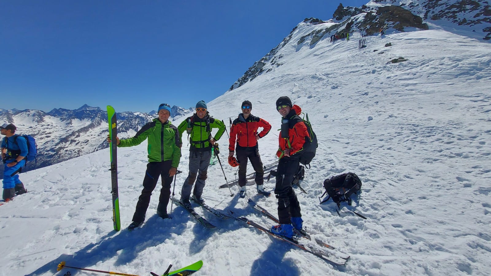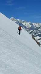 Discesa. Prima parte su pendii esposti a sud-est su bella neve trasformata. Parte centrale, su pendii esposti a est, molto meno bella, ancora da trasformare. Parte bassa di nuovo bella, mai sfondosa.