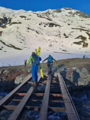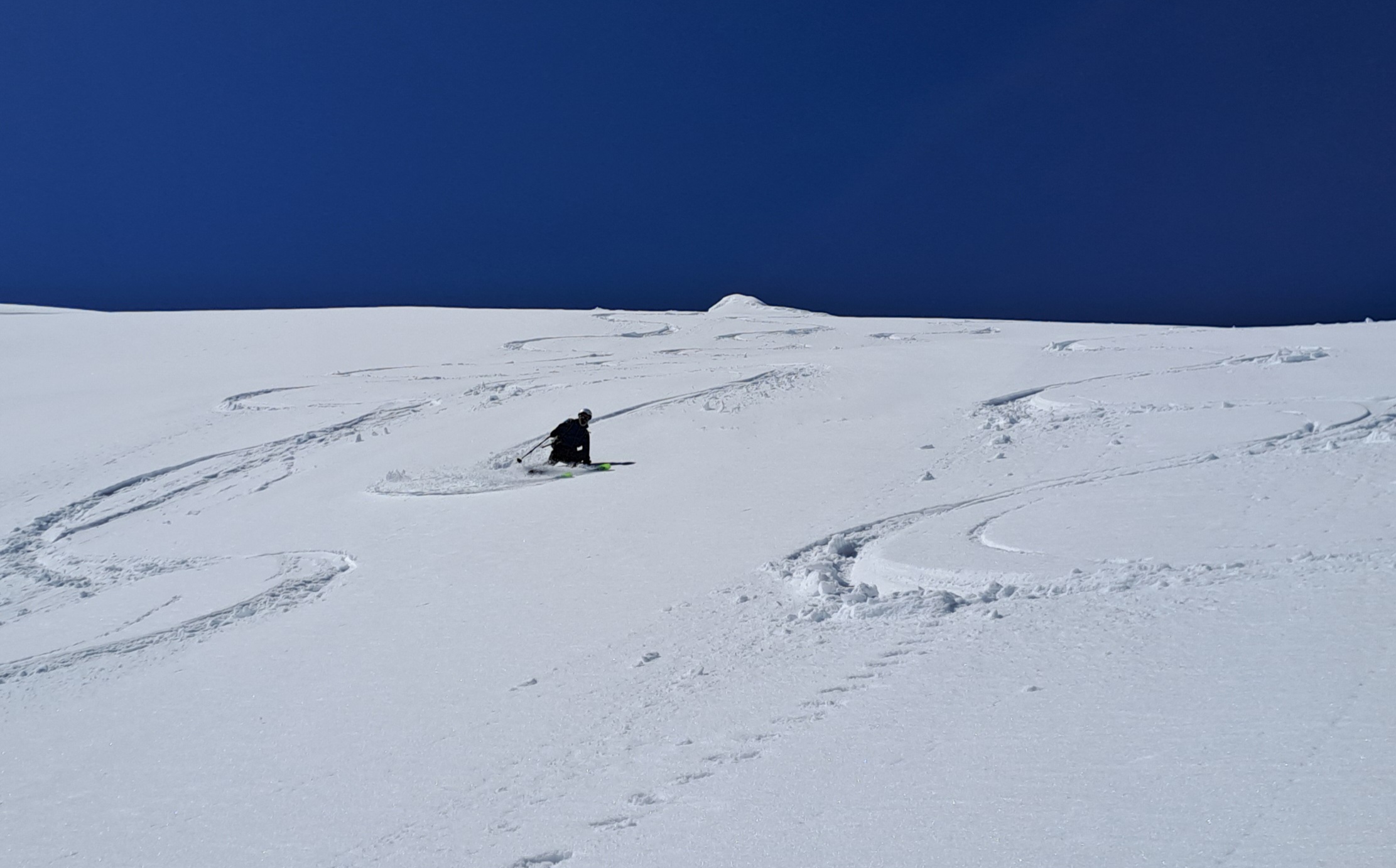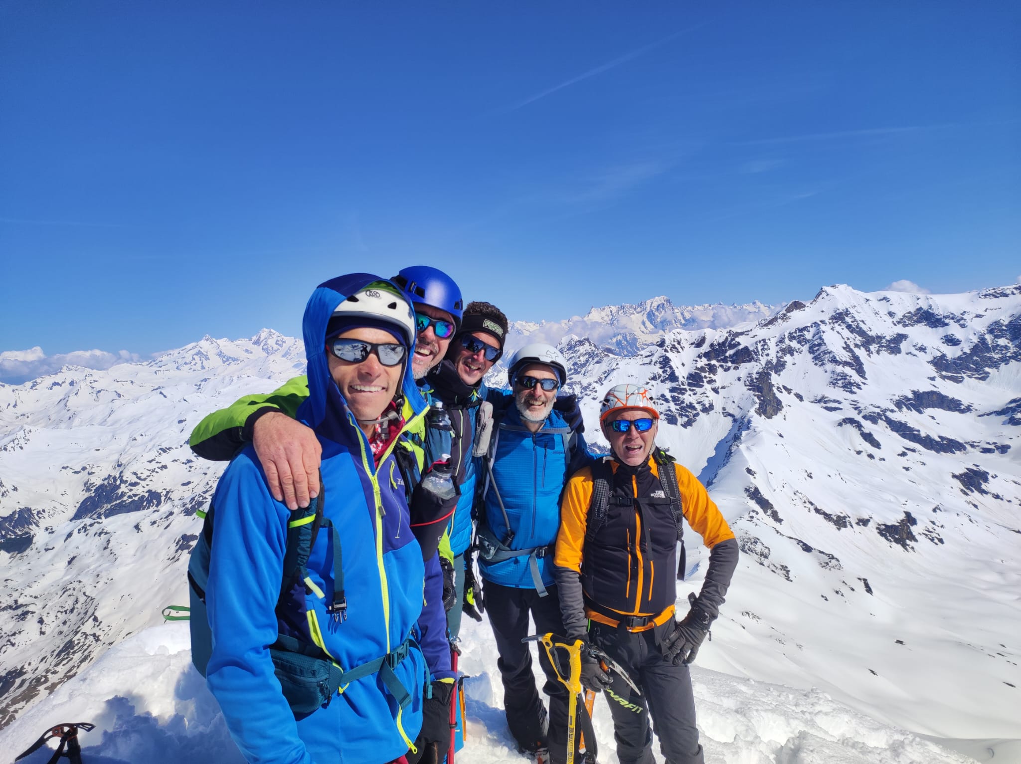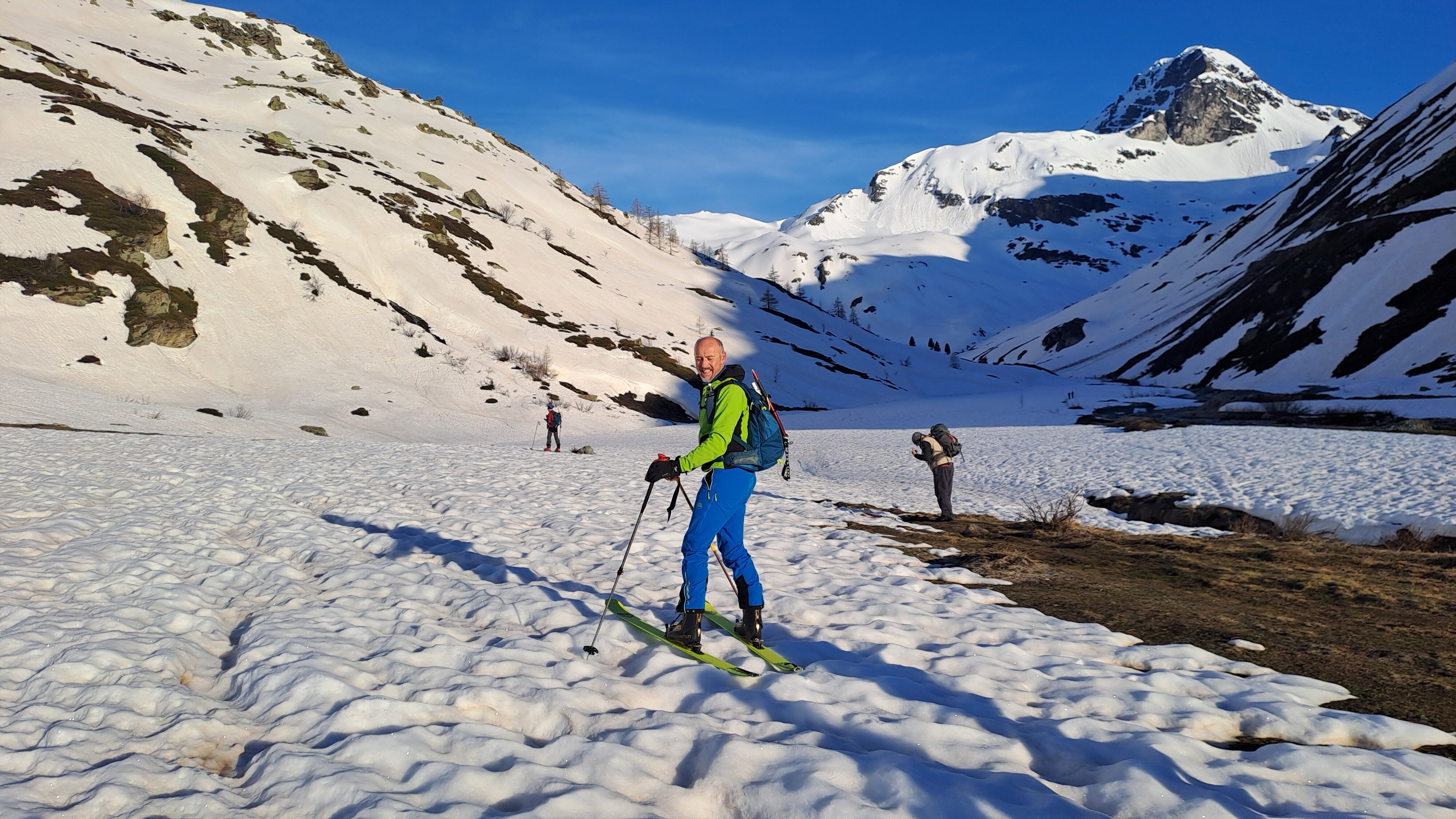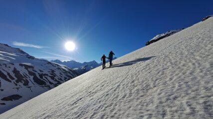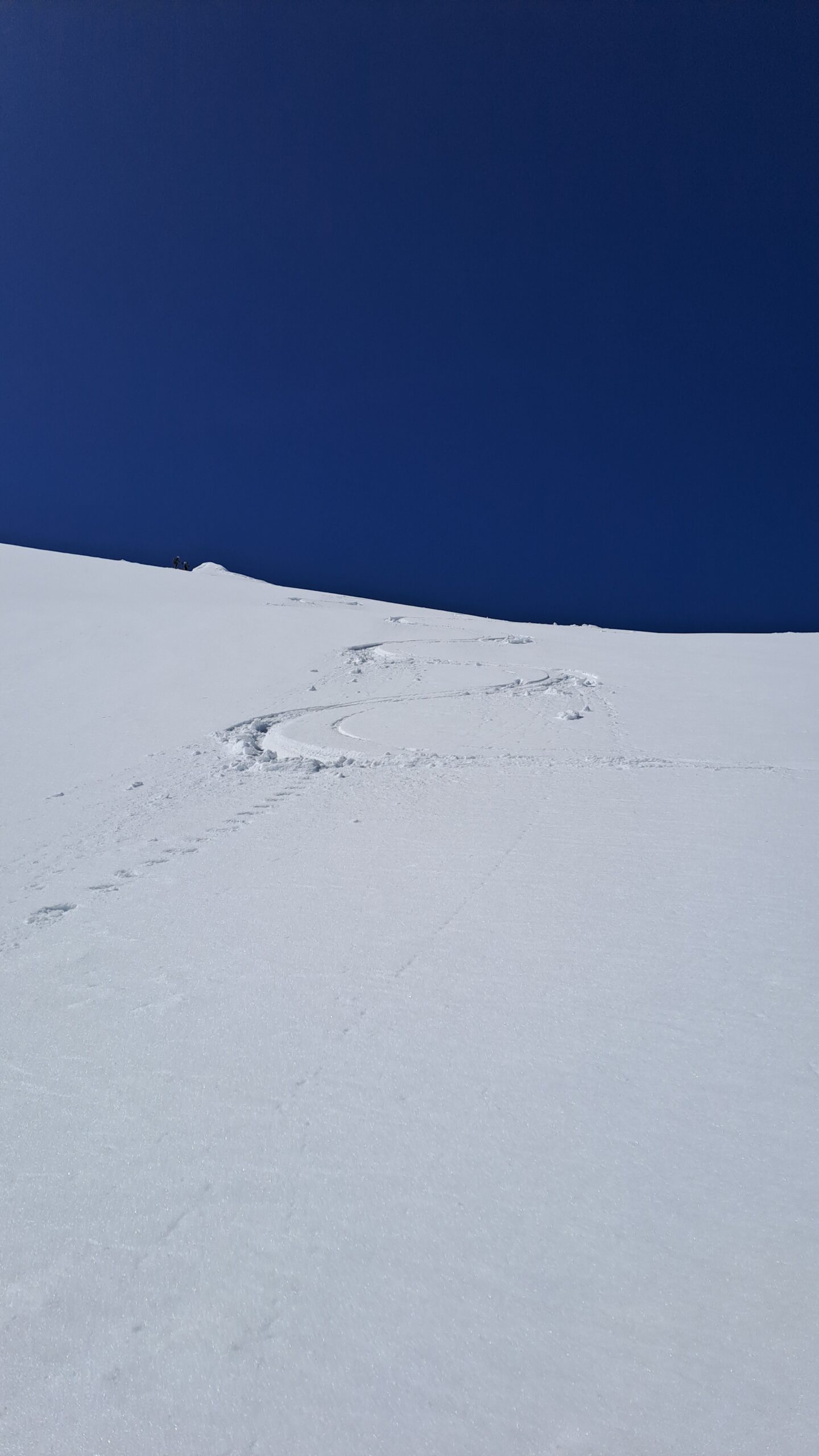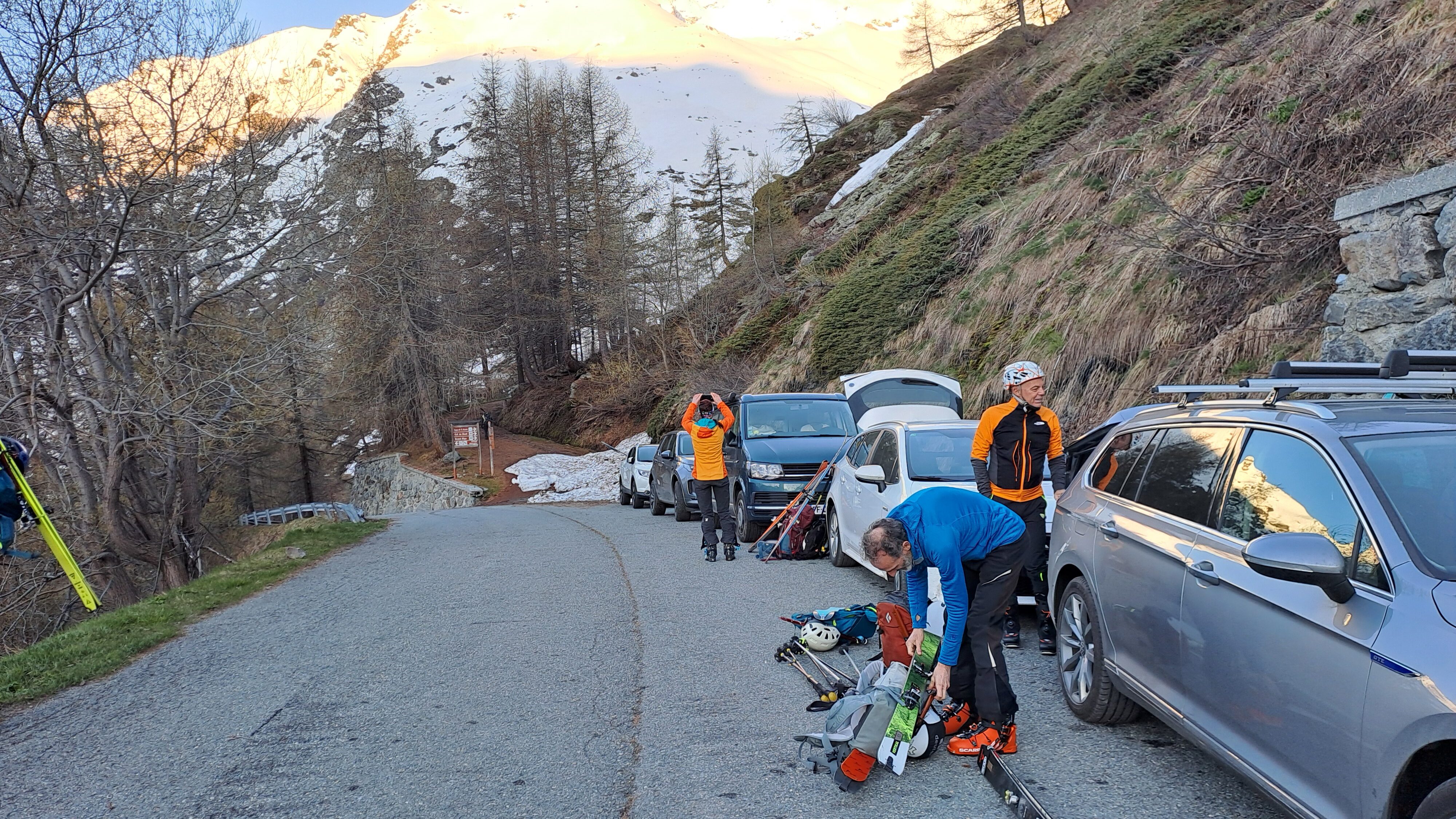 Strada aperta, quindi 10 minuti esatti e si mettono gli sci. Ottimo! Gita in super condizioni, si arriva a neanche 5 minuti dalla punta con gli sci, poi ramponi e in vetta! Discesa iniziata alle 11 su neve subito farinosa pesante e subito dopo firn spettacolare!! Oggi gran caldo e zero vento. Con gli amici pellegrinos…. bella li!!!