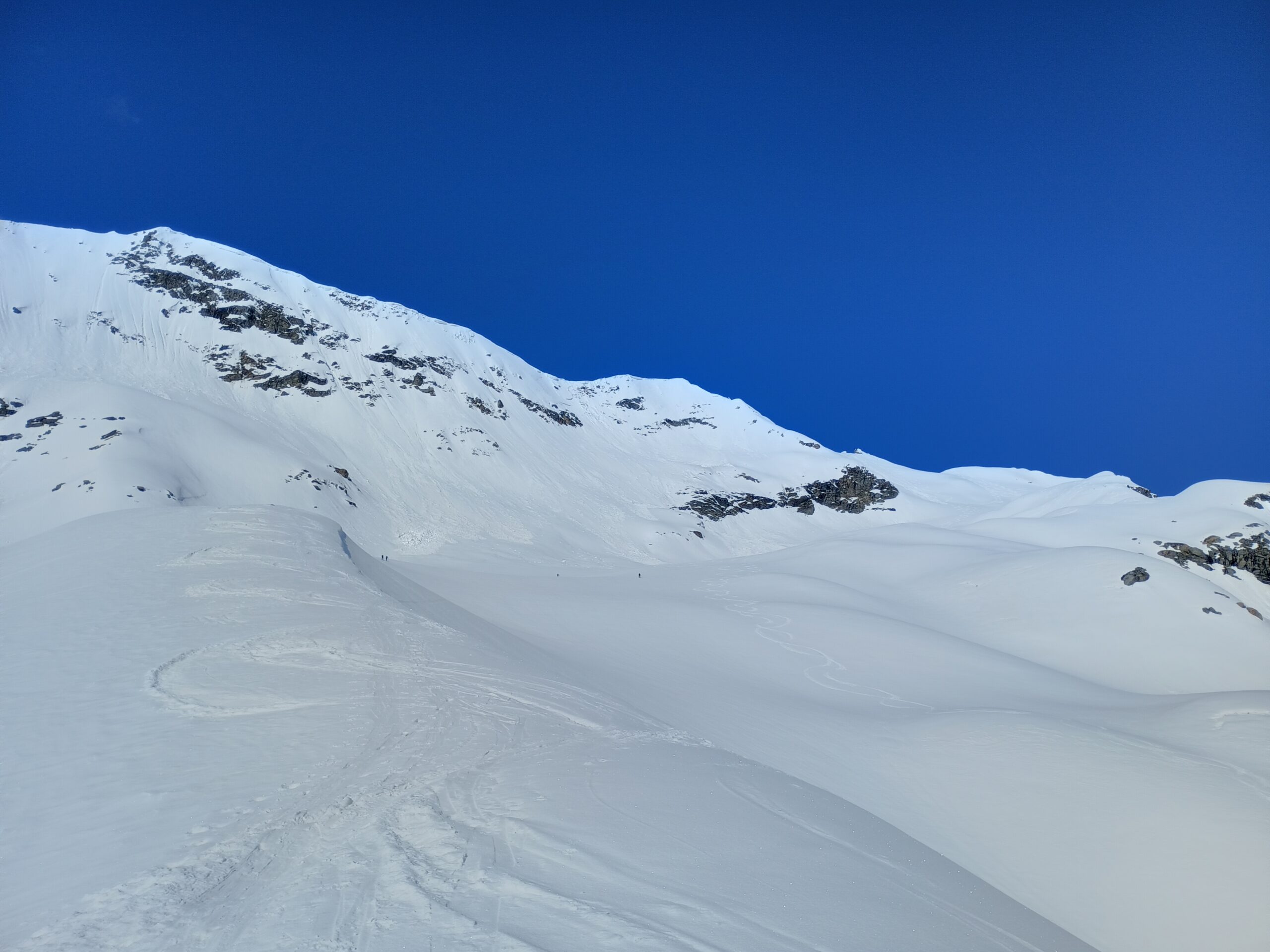 Iniziato a scendere verso le 10:30 e probabilmente era già un pochino tardi perchè la neve iniziava a smollare, primi pendii però goduti! Mi sono poi tenuto a sinistra del canale per evitare di sciarlo con quelle condizioni, buona idea anche se comunque la sabbia e il caldo rendono la neve molle. Poi invece che riprendere la traccia a sinistra ho pensato bene di scendere dritto e finire a ravanare tra gli arbusti… ma comunque sciabile ahah