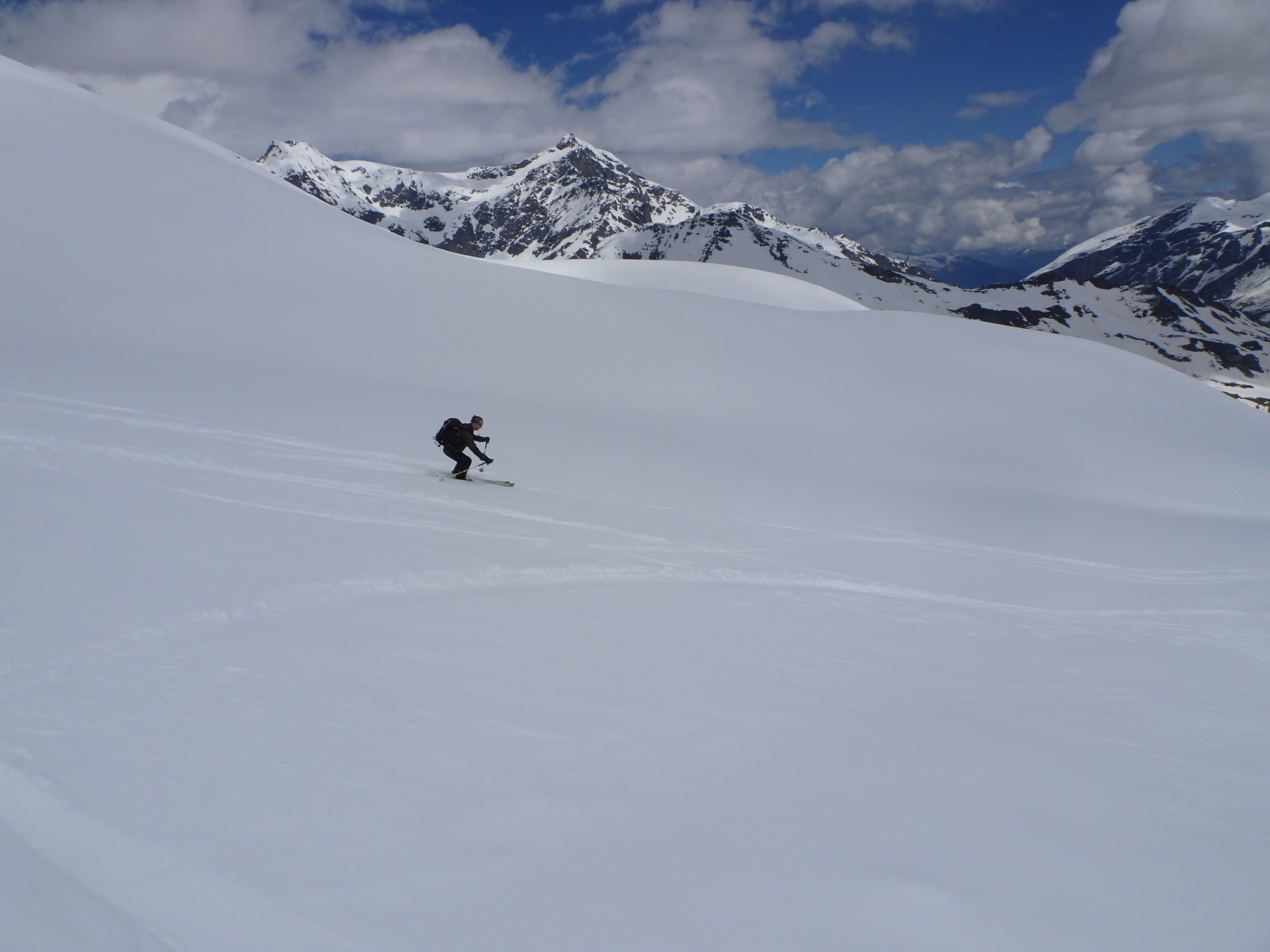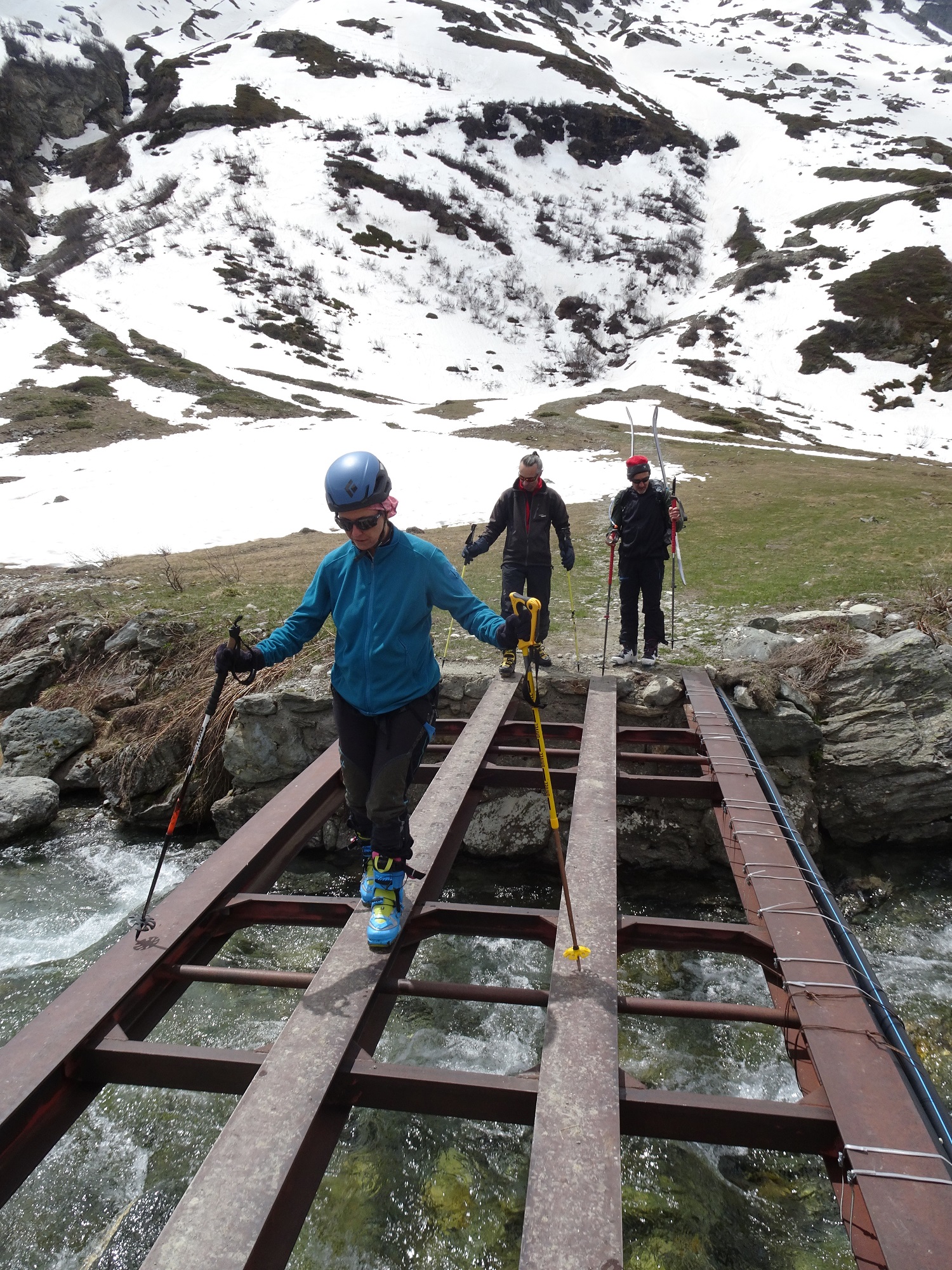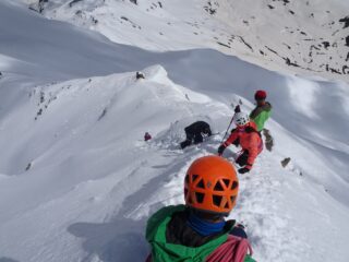 Gran gitone e bella compagnia. Io sono lento per cui siamo partiti molto presto , alle 05:15 e vi garantisco che attraversare il ponte (eufemismo) con le frontali e le travi verglassate è stata la cosa più pericolosa della gita. Portage 15 minuti. Nonostante la copertura nuvolosa notturna aveva rigelato. Coltelli tenuti da cima a fondo. Cresta finale in ottime condizioni. Noi abbiamo usato picca e ramponi per prudenza. Prima parte di discesa su neve recente non ancora trasformata , poi moquette da 5 stelle e nel finale neve scaldata dal sole un po’ sfondosa ma sempre sciabile. Cercando la neve “rosa” un po’ meglio. In compagnia di Sara, Massimiliano, Stefano ed i nuovi amici Valentina e Davide. Grazie ai giovani di avermi aspettato in vetta.