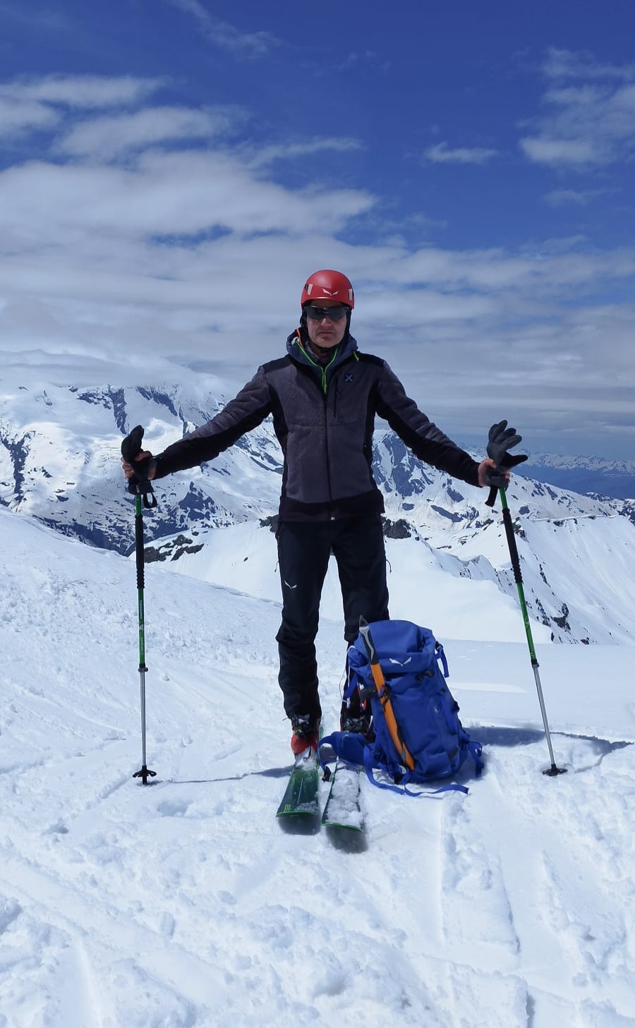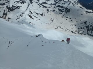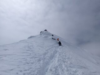Ottimo condizioni di innevamento su tutto il percorso. Gli sci si portano per circa 100 metri di dislivello poi il manto è continuo e sempre più abbondante salendo di quota. Rampant utili nei pendii più ripidi per il buon rigelo notturno. Dal colletto si sale in vetta con ramponi e picca su cresta non difficile ma neppure banale. La neve morbida ha favorito sia la salita che la discesa, fatte in compagnia di un vento abbastanza freddo. Manto primaverile da cima a fondo sempre ben sciabile anche se reso un po’ pesante dal fatto che abbiamo iniziato la discesa alle 12.30. Merenda al parcheggio con Luca, Roberta e