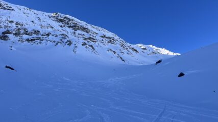 Una 20ntina di altri skialper avvisati sul percorso. Partendo presto il sole si becca solo verso la cima e poi per buona parte della discesa. Diverse tracce in direzione Col du Mont e Mont Quart.