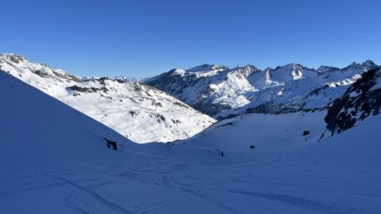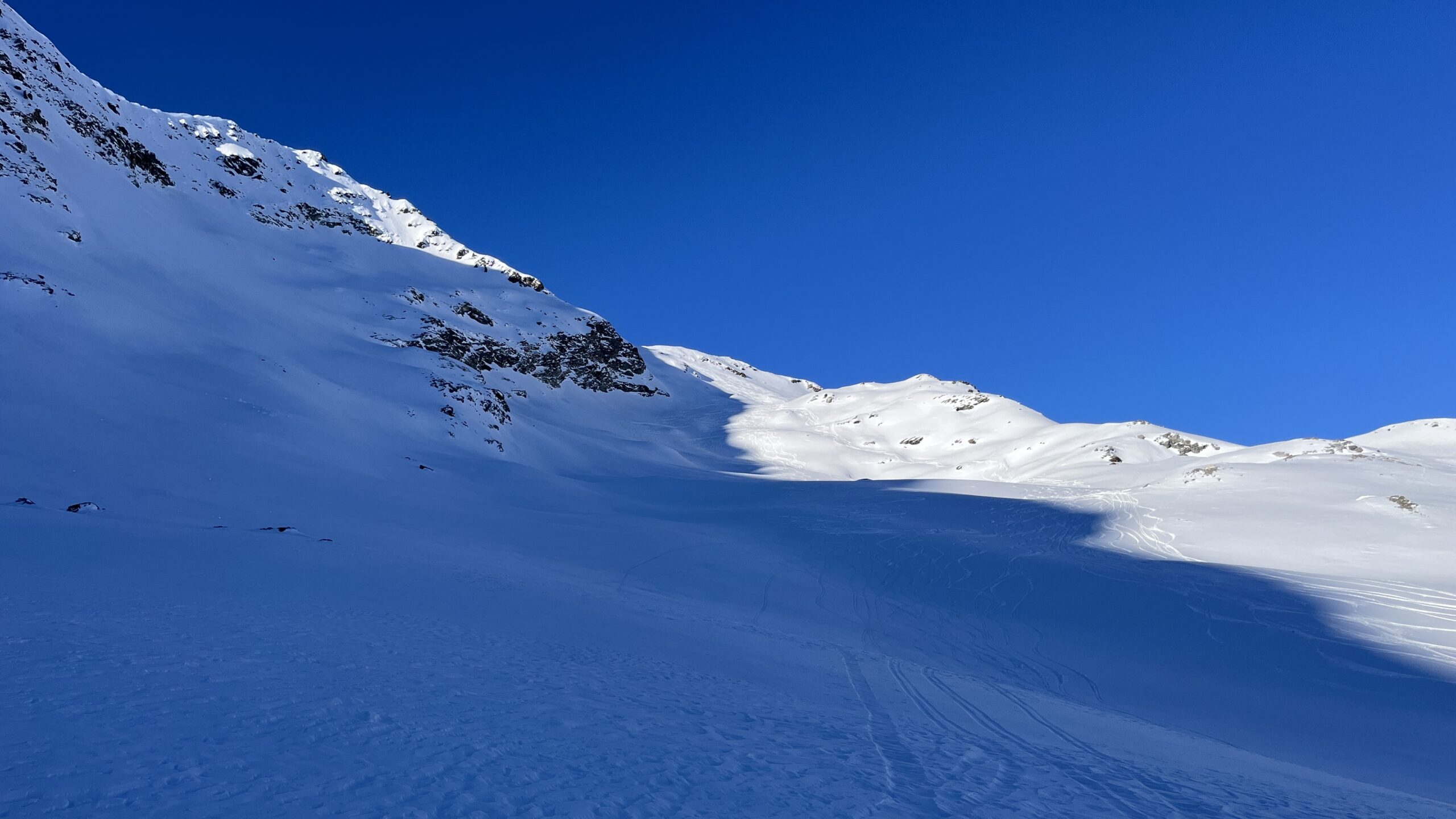 Pendii sommitali in gran parte violati da quei maledetti dell’heliski che facevano i giri avanti e indietro (com’è possibile che sia permessa sta roba???). Nonostante ciò ho trovato delle belle linee di discesa ancora intonse con neve farinosa.