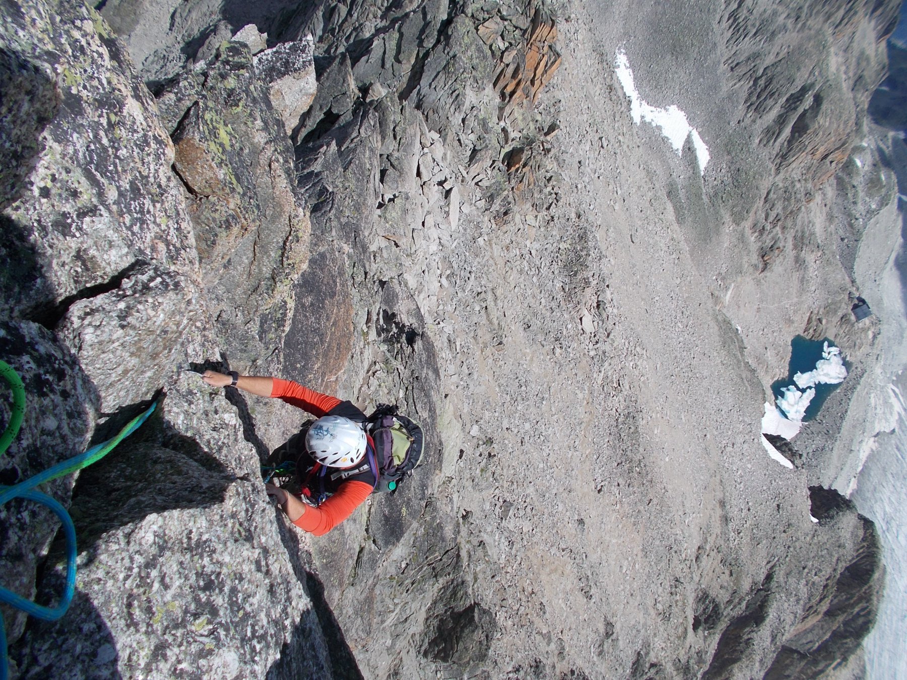 con una doppia da circa 30m. Si arriva alla penultima sosta. Da qui, cengia a dx faccia a monte si arriva sui ghiaioni del versante S/E , seguire tracce ed ometti e con percorso ripido, ma facile, si