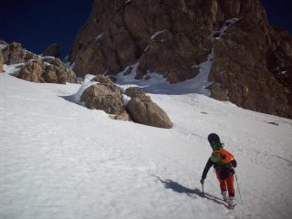 Salito il canale più a destra, tra aiguille oriental d’ Oronaye e Tete de Platasse (canale rosso nella foto). Neve cotta al punto giusto sia in salita che in discesa, bella nel canale e conoide, poi di tutti i tipi fino al parcheggio. Tempo splendido. In 2 con lo snowboard e uno solo ramponi e ciastre.