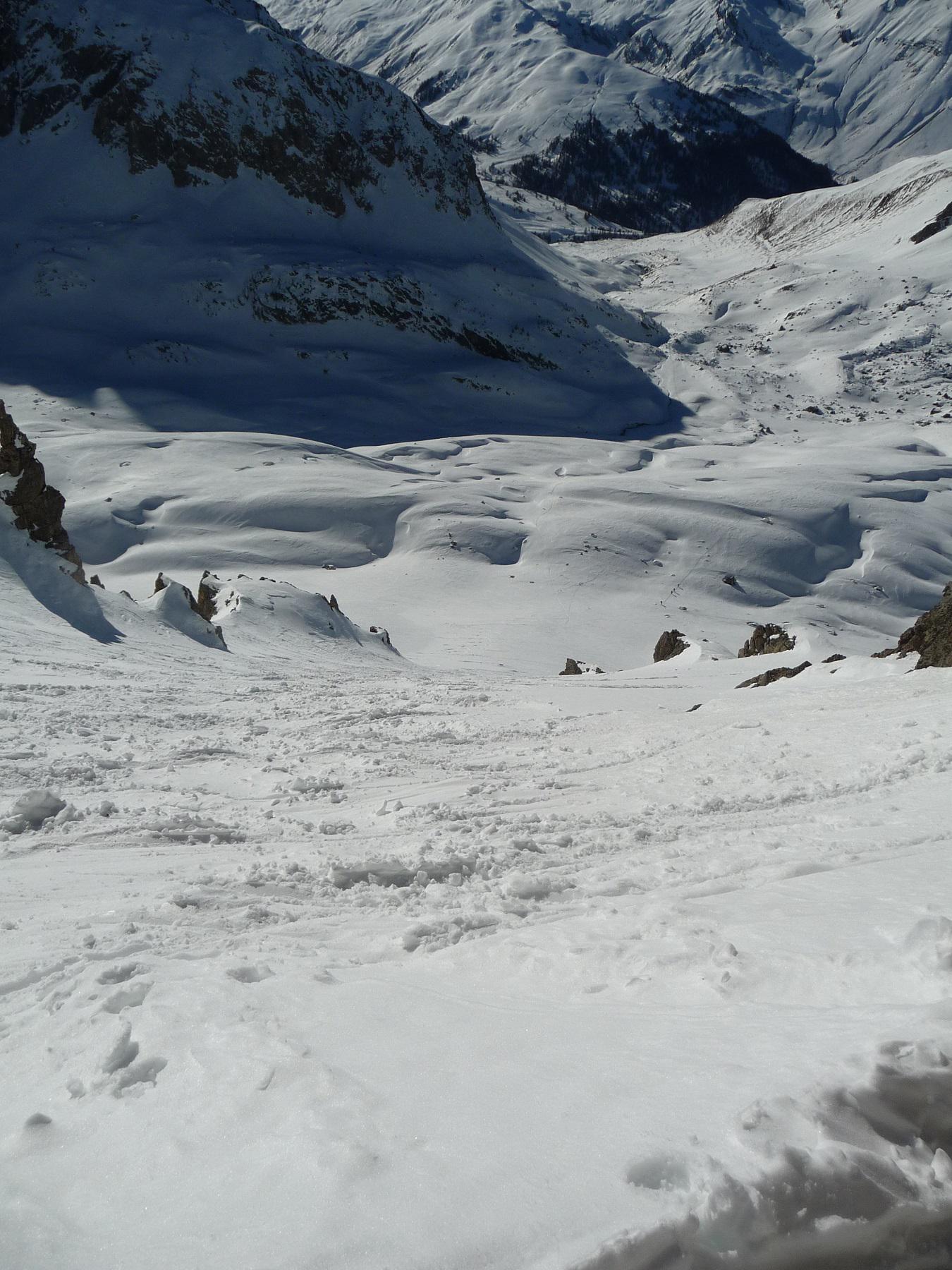 Arrivati alla base del conoide del canale nord ovest della T.te des Blaves rimettiamo le pelli e puntiamo il canale SO di sinistra qui descritto. Saliti con un bel sole sul canale molto tracciato dai passaggi dei giorni precedenti. Arrivati al colletto scendiamo un canale parallelo sulla sinistra più stretto e con solo due tracce. Neve che migliora man mano che si scende con ultime curve su bella neve primaverile.
