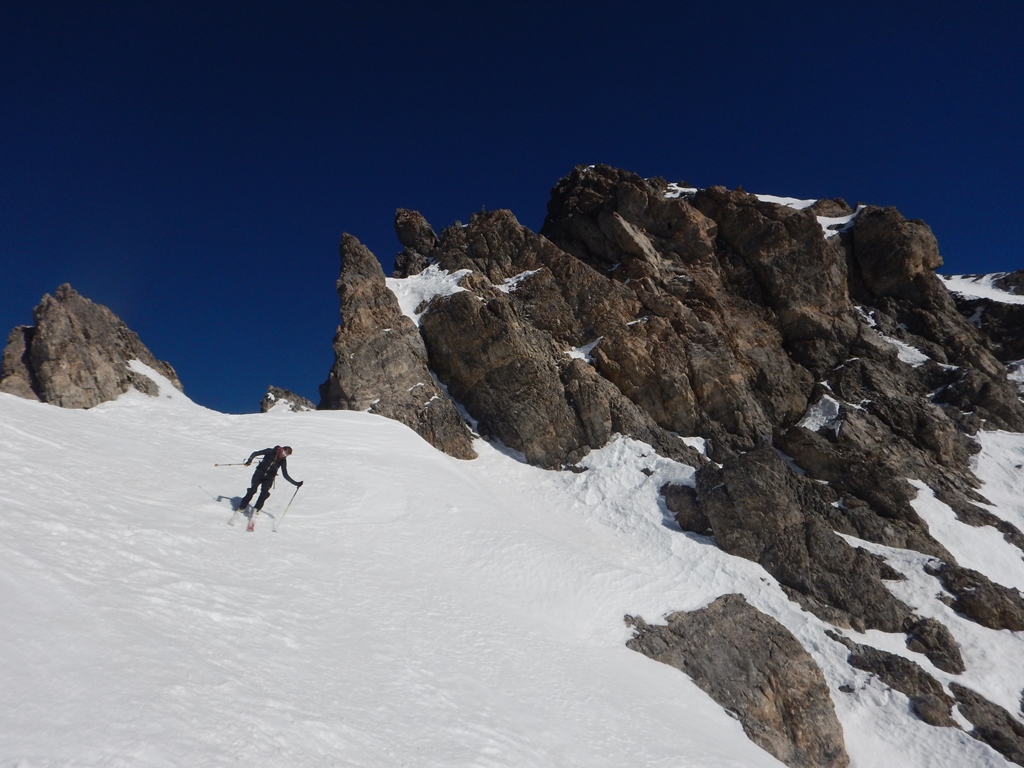 Partenza dal colle della Maddalena con neve giusta ma ancora continua, salito il canale sino a q. 2800 sci ai piedi, rampant oggi non necessari per neve ammorbidita dal sole, poi ramponi per l’ultimo tratto con caldo degno delle spiagge caraibiche. Discesa su neve compatta nel primissimo tratto, poi alternanza di farina pesante e primaverile ed infine conoide su ottimo firn. Tagliato in quota sotto Aiguilles e Villadel sfruttando i pendii finali su bella neve trasformata.