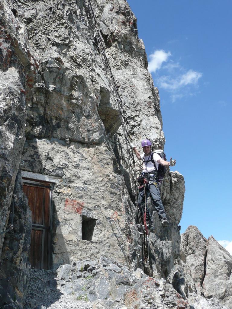 Dopo essere saliti sulla cima con la croce dalla via normale appena 3 giorni fa, stregati da un ambiente incredibile, oggi siamo tornati in zona per percorrere questa ferrata dai connotati alpinistici, davvero unica nel suo genere, anche a detta del socio Andrea C. che vanta un notevole curriculum anche in altre regioni. Per me che, sono un escursionista più vocato al wilderness e al survival in ambienti boschivi ce la devo mettere tutta, questo ambiente non è facile per il ferratista o escursionista medio, generalmente scarso o privo di esperienza su roccia di questo tipo, data la presenza di tratti non protetti, di scariche continue, sfasciumi e dalla discreta esposizione presente in alcuni punti, a partire dallo stesso sentiero di avvicinamento, che sin dai primi metri dopo il bivacco Enrico Mario non permette la minima distrazione. Ma grazie alle ottime condizioni odierne, il discreto meteo del periodo ed alla presenza di poche persone lungo la via, riusciamo a percorrerla senza fare uso della corda ed altri accorgimenti oltre al normale set da ferrata col casco. Impressionante l’arrivo sulla cima al termine della scala, molto affilata con vista mozzafiato sulla ripida parete della cima principale e sulla cresta che la collega. Curiosi i 2 ricoveri intermedi, nel primo sono presenti 2 materassi arrotolati e rispettivi tavolati in legno che invitano a farsi una dormita in santa pace. Buone le indicazioni con vernice gialla e nastri da cantiere che guidano all’attacco che però sono ben visibili solo durante la salita. Un sincero ringraziamento a chi ha lavorato per il ripristino di questa opera mantenendo intatti ove possibile i materiali e la struttura originale . Rientrati al bivacco Enrico Mario avendo ancora qualche ora di luce a disposizione proseguiamo lungo il sentiero Roberto Cavallero fino al monte Scaletta compiendo un interessante anello lungo i resti delle strutture militari della zona. 45 minuti prima del bivacco Enrico Mario, durante l’avvicinamento, è presente l’unica fonte d’acqua dalla quale abbiamo fatto rifornimento, depositata nel bivacco al fresco e recuperata durante il rientro. Sulla scala finale sono presenti alcuni trefoli e qualche gradino piegato che non pregiudicano in alcun modo la progressione, salita comodamente assicurando sui gradini stessi.