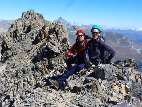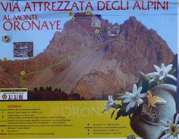 bellissima via di salita alla cima Dronero in ambiente storico e ricco di reperti. L’unica pecca è che non si arriva in punta all’oronaye e arrampicare per cresta su quegli sfasciumi, non mi sembrava il caso.Per arrivare all’attacco ci vogliono circa 2 ore di cammino e sono moooolto utili i bastoncini, data la salita su sentiero sdruciolevole. Il grado di difficoltà è dato dalla salita su una vera montagna…e non su un parco giochi di una ferrata classica! In realtà è una via attrezzata, dove si procede su roccia e si è preservato l’ambiente evitando di mettere gradini di ferro. Anche per chi non è amante di ferrate, è una bella salita in ambiente maestoso, dove si procede in sicurezza su cavi d’acciaio senza dover usar le corde… ma può essere utile in caso arrivi il brutto tempo, utilizzando le soste attrezzate. Direi ideale per chi inizia ad arrampicare o è scarso come il sottoscritto!