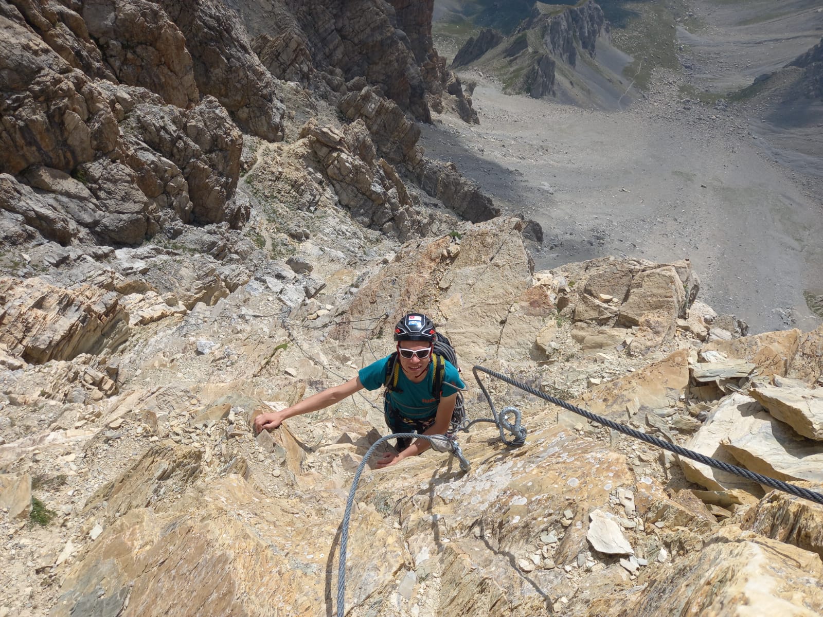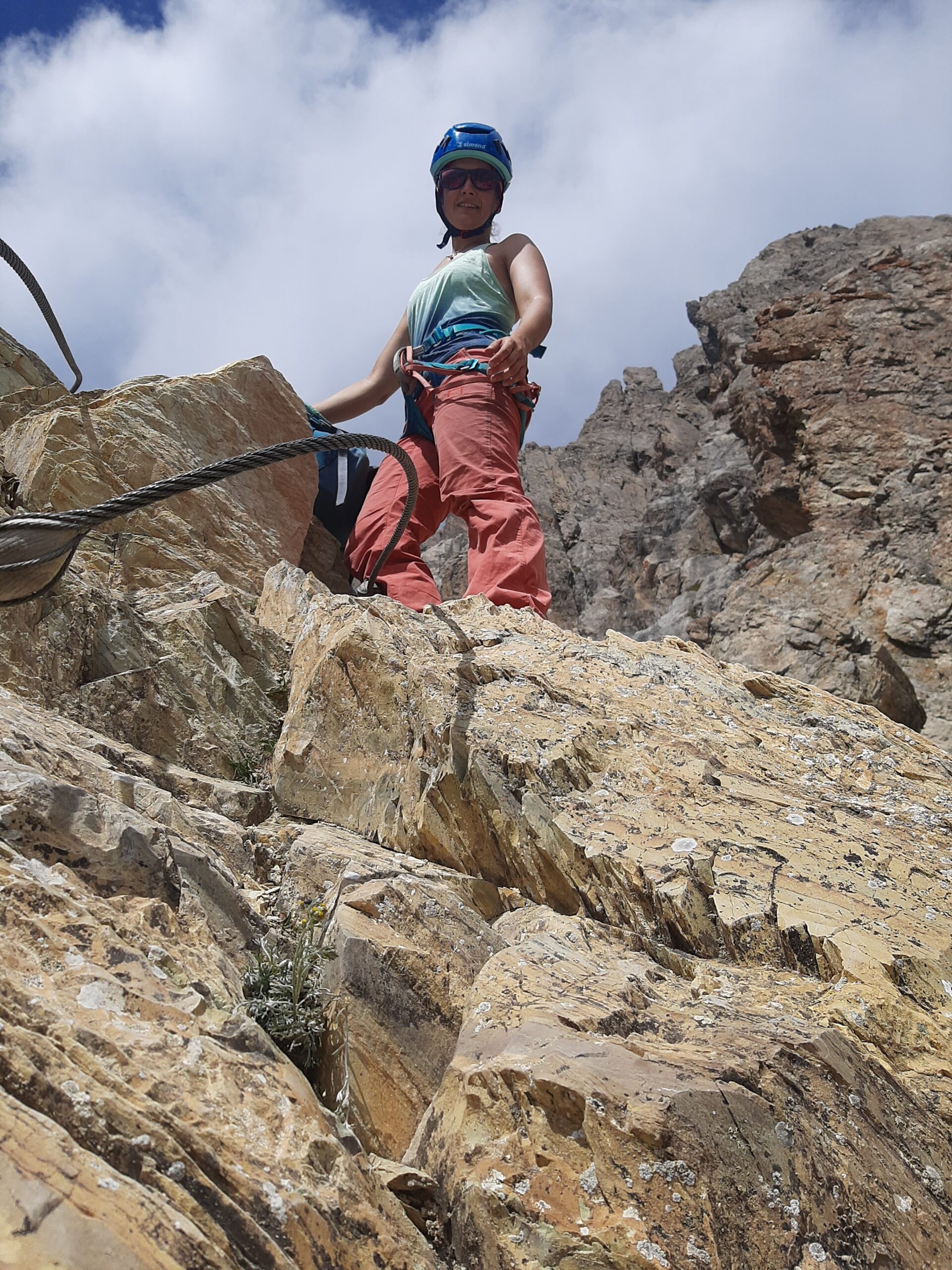 Partiti dal pontet, saliti per il col Feuillas e scesi al bivacco Enrico e Mario. Da qui si prosegue per l’evidente sentiero, sono presenti dei chiodi grandi in ferro x la conserva e qualche scalino qua e la ma è praticamente una camminata fin sotto la scala finale dove è presente il cavo x attaccarsi con la longe; i gradini sembrano non godere di buona salute ma in realtà sono stabili, in breve si è in punta (1h dal bivacco circa), impossibile perdersi, utile il casco ci sono molti detriti che muovono.
