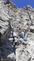 Abbiamo utilizzato una corda per fare sicura nel primo tratto poi le longe dove il percorso è attrezzato con i cavi d’acciaio. Fondamentale il caschetto per proteggersi dalla caduta di pietre soprattutto quando hai altra gente più avanti…