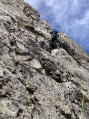 Torno dopo una ventina di giorni, dopo essere tornato indietro a inizio mese dall’idea di solitaria, causa qualità della roccia. Legati in cordata è tutto facile e tranquillo.