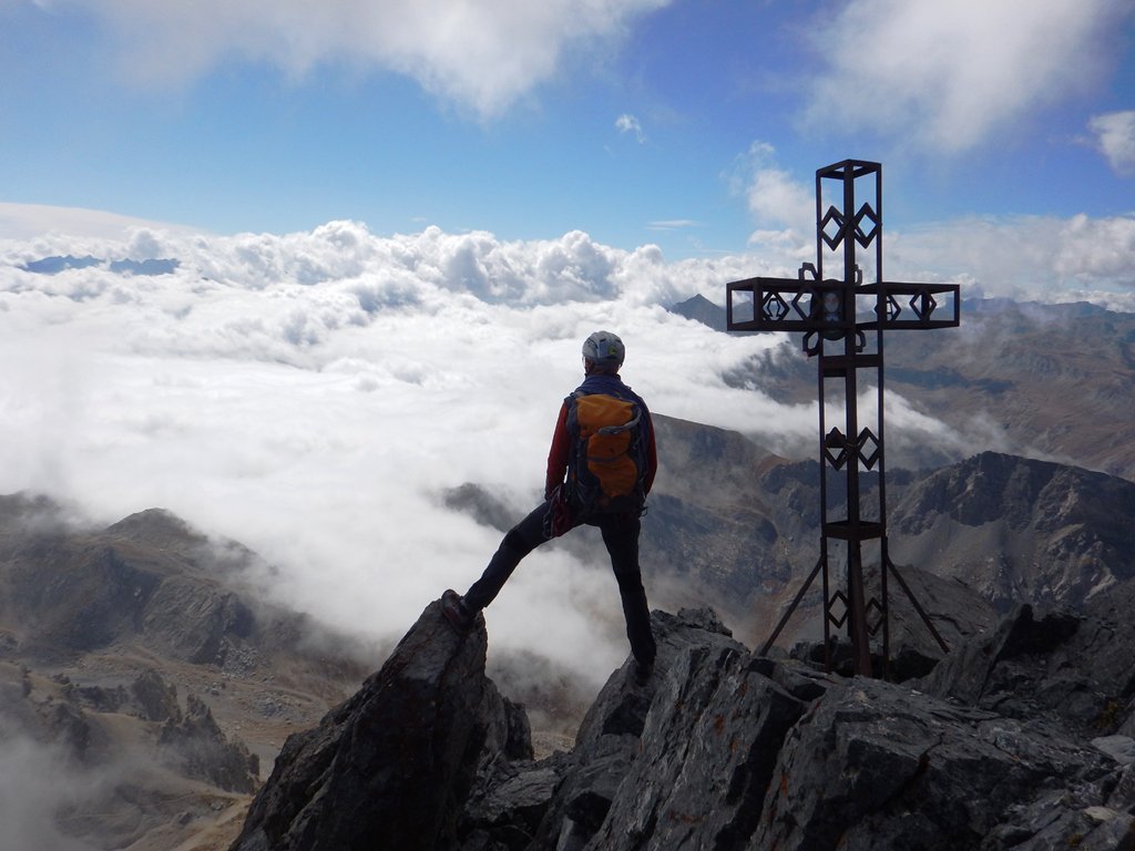 Valle Stura stamane deserta come non mai e avvolta nella nebbia più densa, ma quando governano le correnti orientali il colle della Maddalena è la giusta via di fuga dalle nuvole basse: cielo sereno in Francia, con gli ultimi sbuffi di nebbia sino al lago dell’Oronaye, poi l’azzurro ad accompagnarci su per il canale detritico che con gli anni non migliora, e finalmente la crestina finale che nei passaggi in ombra ti ricorda che qui più che l’autunno è già arrivato l’inverno… Splendida oggi la croce a dominare le nubi, nel silenzio totale.