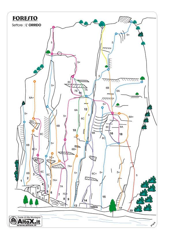 - 17. Luce Rossa 5+ / 6A+ / 6B (si può arrivare ad S2 dalla base con corda da 70m)