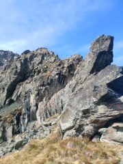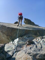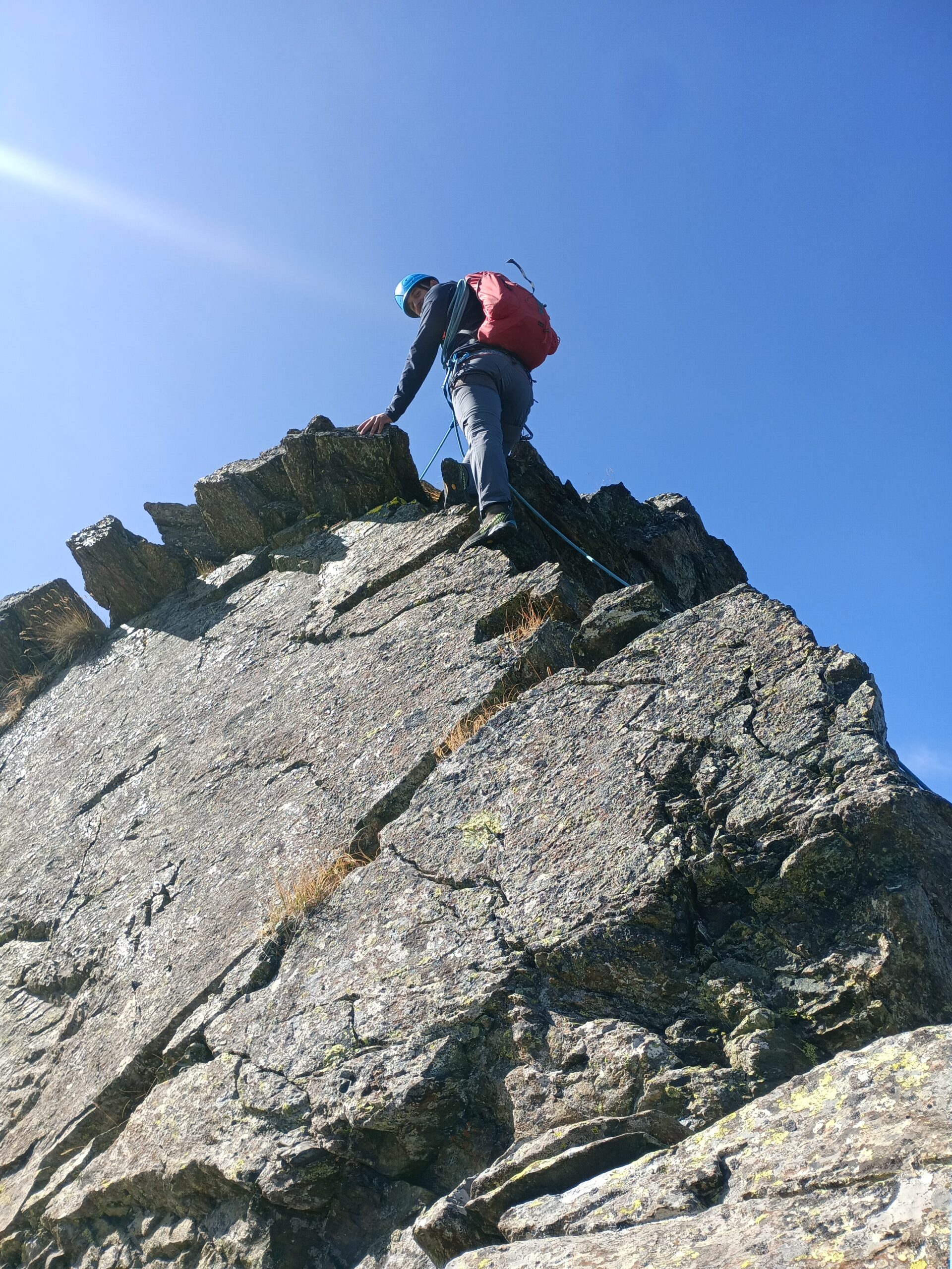 Cresta davvero molto facile, qualche chiodo dove serve, altre protezioni a discrezione personale… Fatta tutta in conserva. Dalla vetta siamo scesi al colletto per risalire anche la punta sud, poi ritornati al colletto e scesi nel canalone detritico, facilmente percorribile.