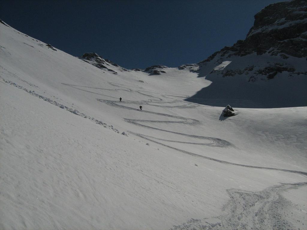 Dal rif. Amprimo, o in stagione più avanzata dal Toesca, si segue l’itinerario 26 del rif. bibliografico alla Punta Rocca Nera. Giunti al Colle della Gavia 2775 si scende direzione O tenendo la dx or. del largo pendio che scende sul lago del Chardonnet. Si punta ad un’evidente cengia nevosa sospesa tra due salti di roccia sul pendio posto a N del lago stesso. il pendio ha un’inclinazione di circa 30° e va affrontato in condizioni di neve sicurissime.