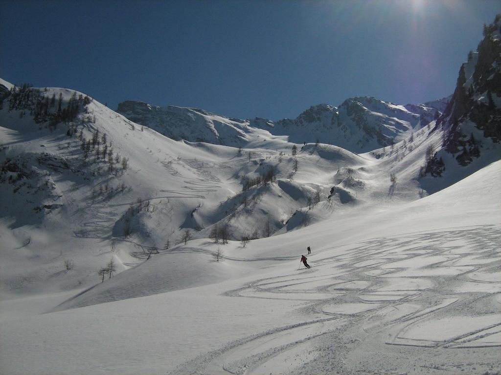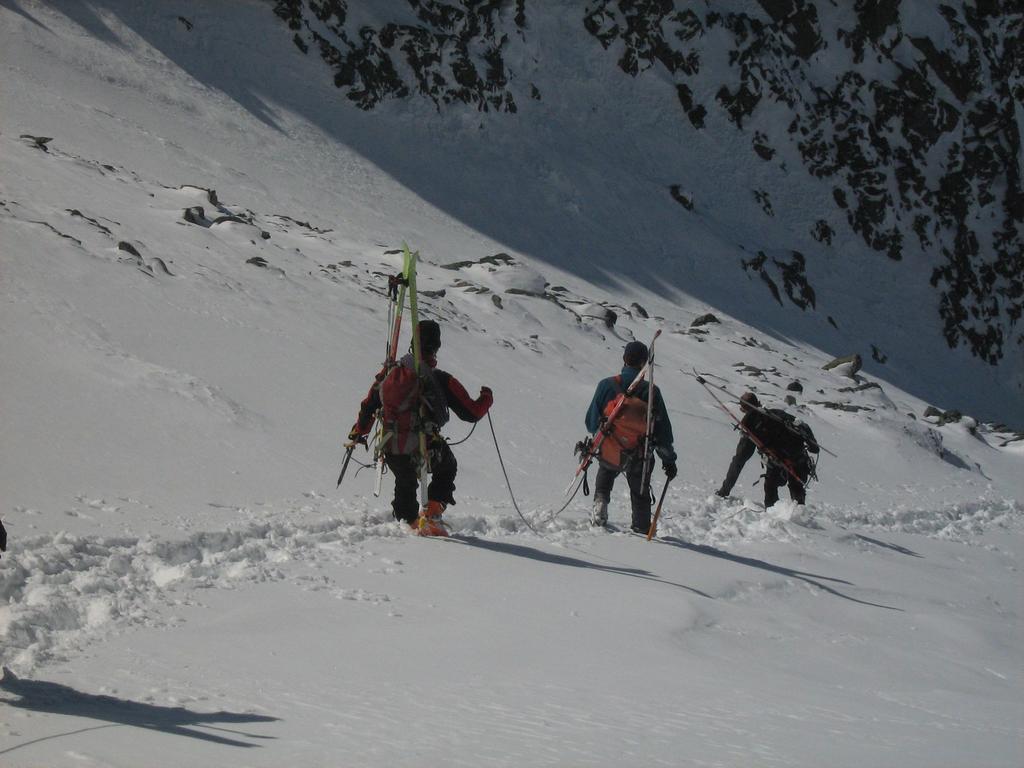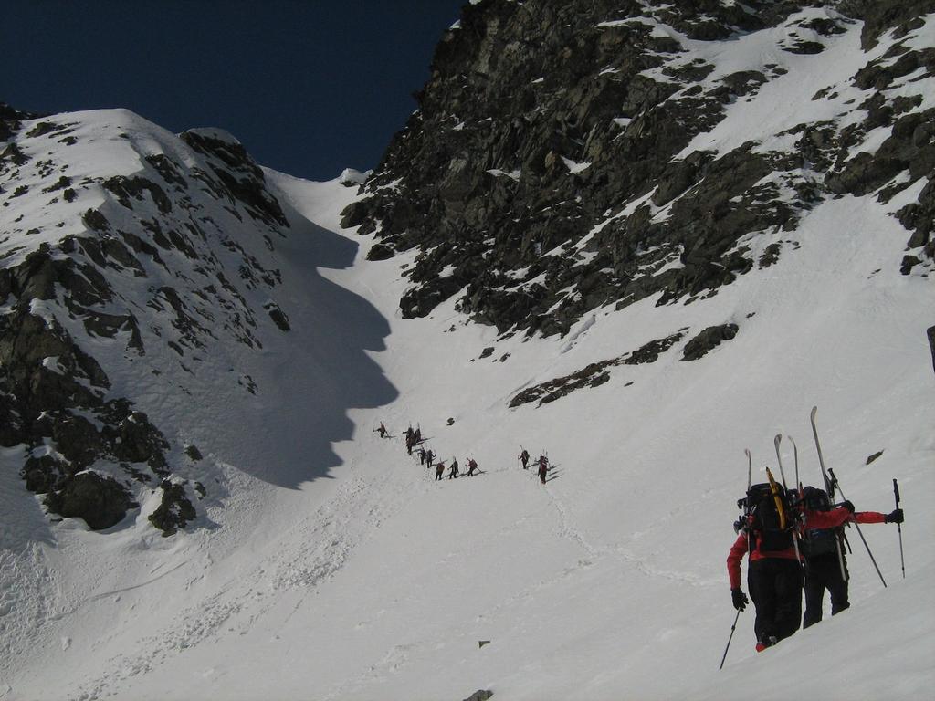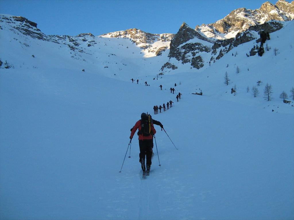 Giunti sulla larga cengia la si percorre in leggere discesa in direzione dell’evidente canale NE del Mte Orsiera ( gia’ visibile dal colle della Gavia) . Si scende fino a quota 2650; da qui si inizia a risalire verso il canale che separe le due cime dell’Orsiera; la salita può essere fatta per circa 70 m di dislivello ancora in sci oppure, più convenientemente se la neve porta, direttamente a piedi fino a sbucare sull’aereo colletto che separa la cima Sud e quella Nord del Mte Orsiera.