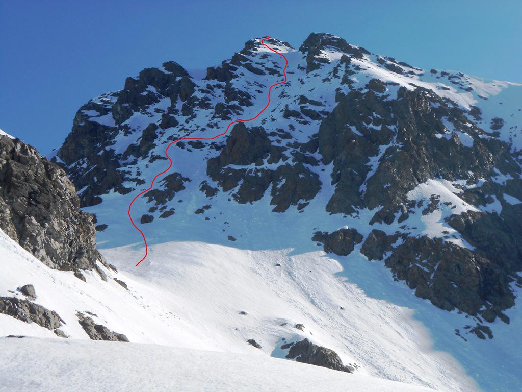 Una volta al colletto si traversa via via verso sx fino a raggiungere il canale, che sbuca tra Punta Sud e sua anticima. Percorrere il canale da sx verso dx fino quasi al colletto sotto l’anticima, quindi piegare a sx per passare una barra rocciosa e tornare in cresta verso dx fino a raggiungere la cima.