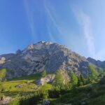 Da qui cercare prima e poi seguire il sentiero nr 380 per la Val Gelada. Chiedete alla malga dato che le molte recinzioni per le mucche disorientano. Usciti dal bosco continuare sulla sinistra e seguire il sentiero fra i pascoli. Arrivati sotto alla Val Pestacavre, percorsa da un tubo per l’acqua, di colore blu si è in vista del Pilastro ben riconoscibile dalla foto con delle grosse nicchie in alto a sinistra. Abbandonare il sentiero e salire in direzione della parete per portarsi sulla sinistra di un conoide ghiaioso alla base di una bella placca chiodo rosso alla base (1,45h circa).