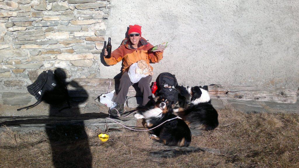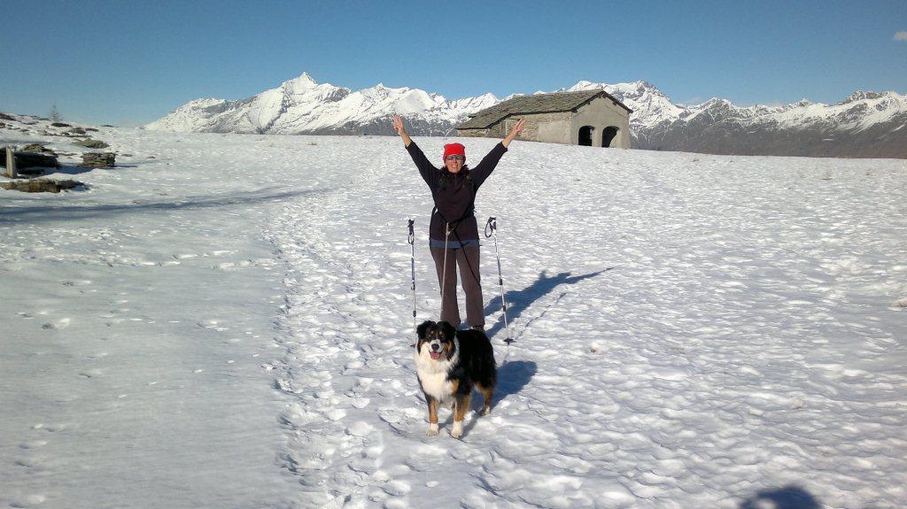 Bella passeggiata in alternativa ai pranzi Natalizi, con Cri e i due cagnetti al guinzaglio causa camosci e caprioli… Saliti dall’Alpe Fumavecchia seguendo il bel sentiero dei Franchi, poche chiazze di neve solo negli ultimi metri. Dal piano innevato abbiamo proseguito sull’altro versante al sole del tutto privo di neve se non per un po di ghiaccetto sul sentierino e neve continua sugli ultimi metri della crestina finale per la punta Salancia. Ci siamo fermati all’anticima non avendo con noi i ramponi utili per la neve ghiacciata sino in cima. Tornati al Pian dell’ Orso ci siamo fermati al sole accanto alla Cappelletta per il nostro Pranzo Natalizio: pane e salame e un bicchio di Barbera!