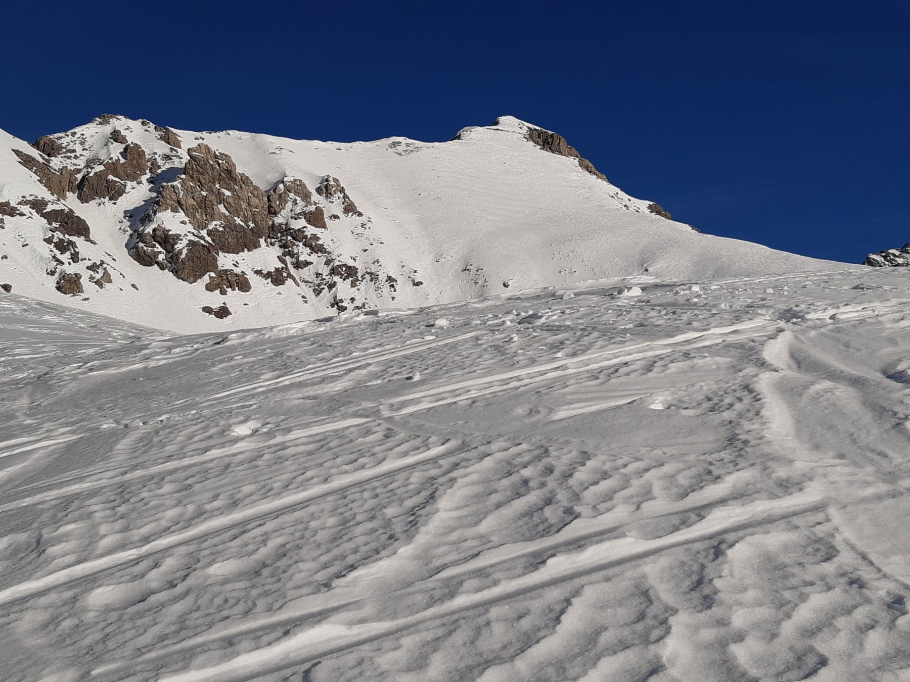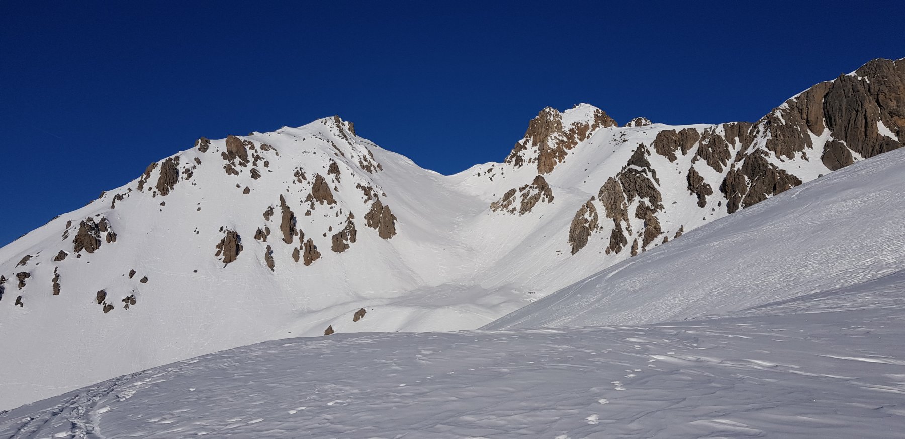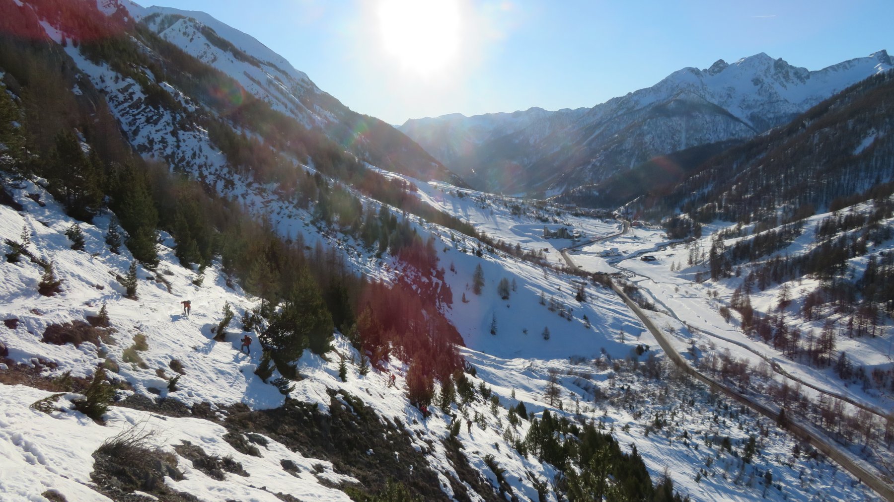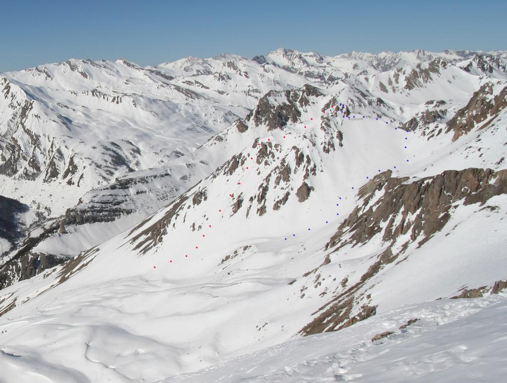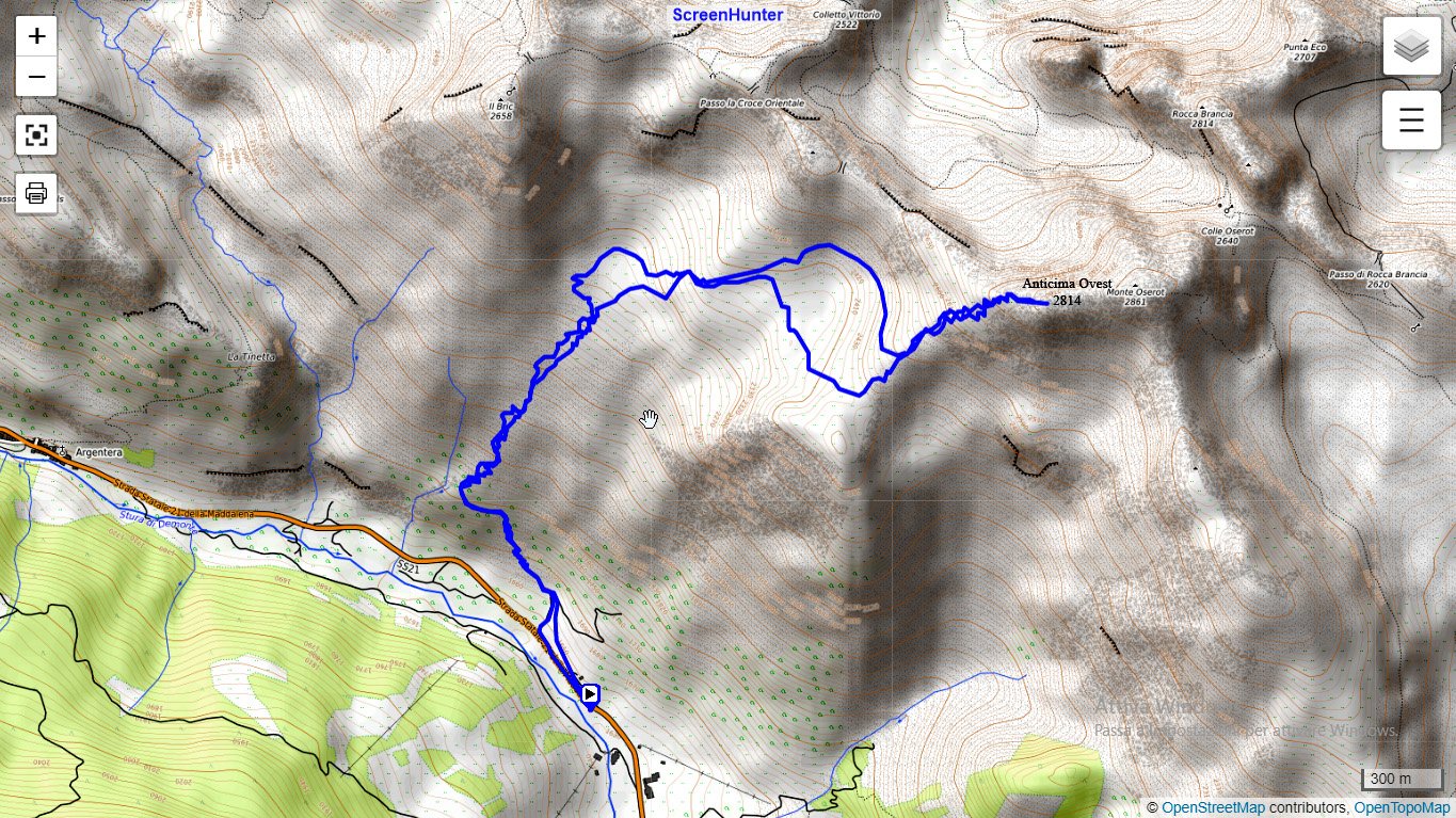 Dalla stazione sciistica Argentera, P. per accesso cabine Enel, Inoltrarsi con un diagonale verso una rada pineta puntando ai ripidi pendii che adducono alle pendici de Il Bric .Salire i pendii alquanto sostenuti portandosi in un concone superiore più dolce qui piegare decisamente dx e raggingere l’anticima.