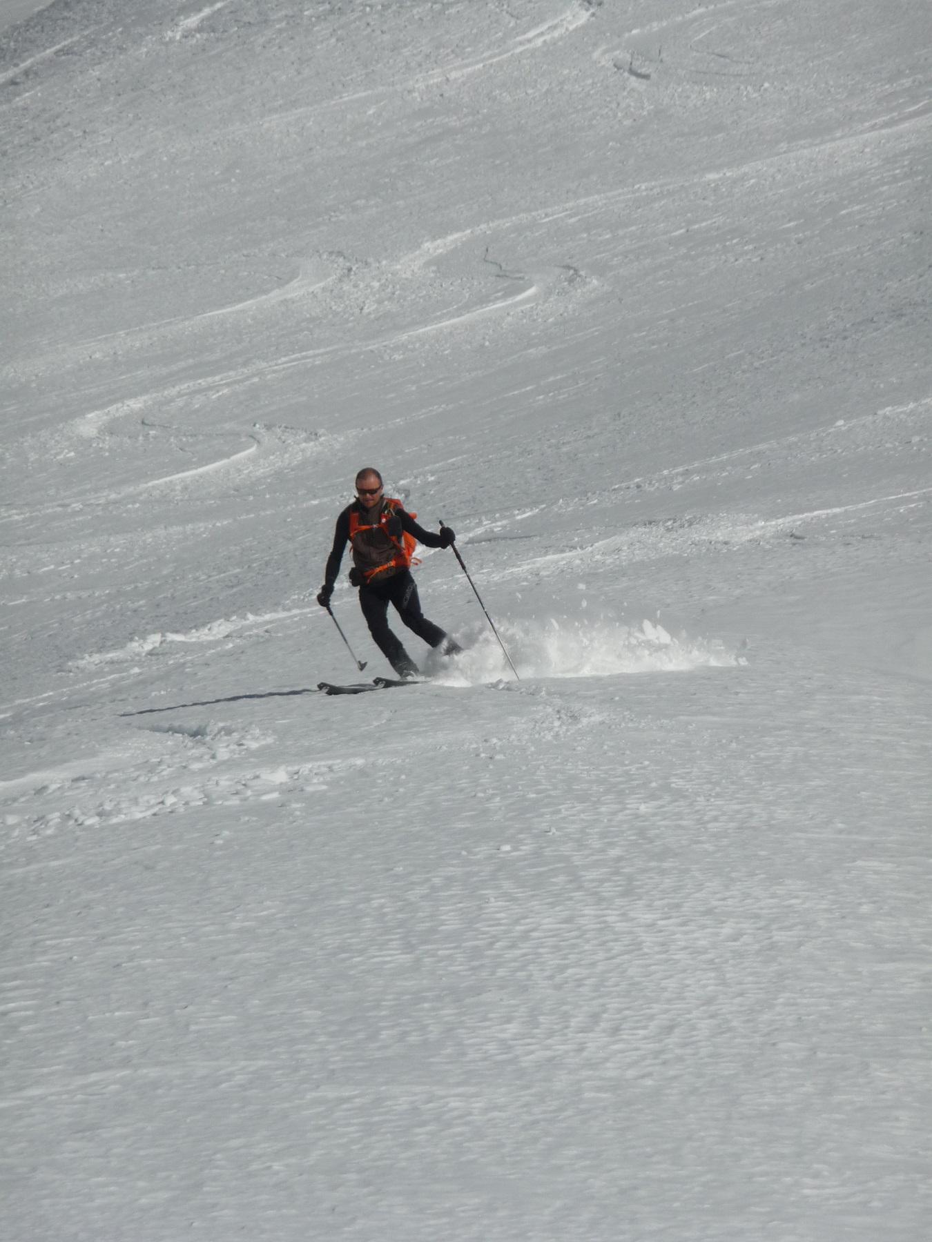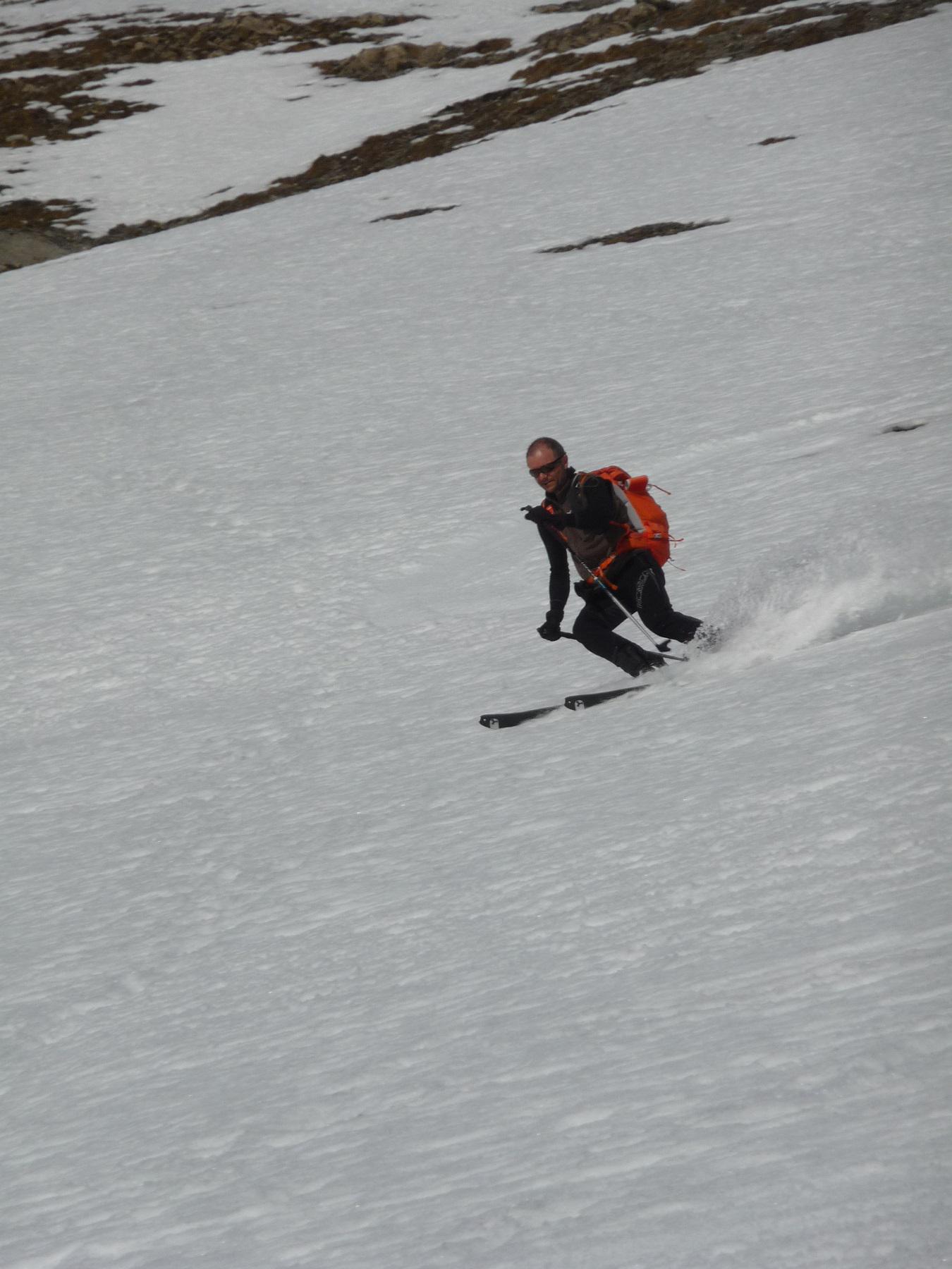 In arrivo da il Bric facciamo un traverso sul pianoro e risaliamo all’Oserot, gli sci partendo da Bersezio si portano per 300m abbondanti. Neve sul pendio sud ovest molto dura, oggi non ha mollato nella parte alta. Saliti sci ai piedi con i rampant fino alla crestina finale fatta con i ramponi, tutti eccetto uno… Discesa cercando i pendii con esposizione più ad est ma per i primi 400m la neve era molto dura. Poi tratti di farinella nella parte centrale cercando l’esposizione ovest e infine goduria pura nella parte bassa su primaverile spettacolo.