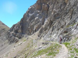 Giunti al PASSO CROCE in sella a mtb si raggiunge il bivacco VALLI (porre attenzione ai numerosi buchi dei vari condotti militari)dal VALLI su single track particolarmente esposto (X I MENO TECNICI SCONSIGLIATO PROSEGUIRE IN MTB,BENSI PORTAGE!!!)si giunge al passo PERONI mt2580, PORTAGE 70% MTB 30%.