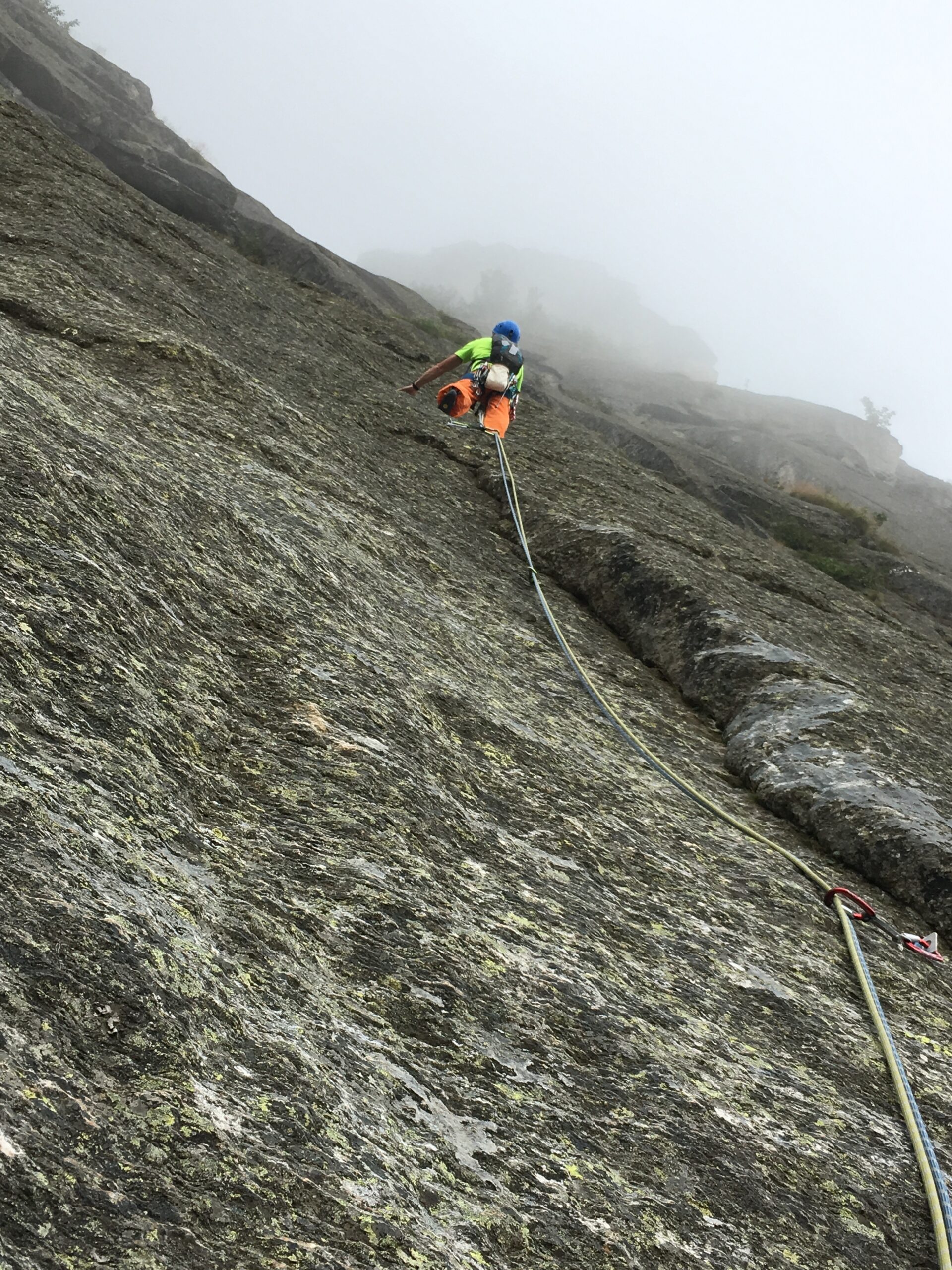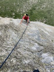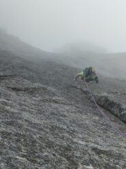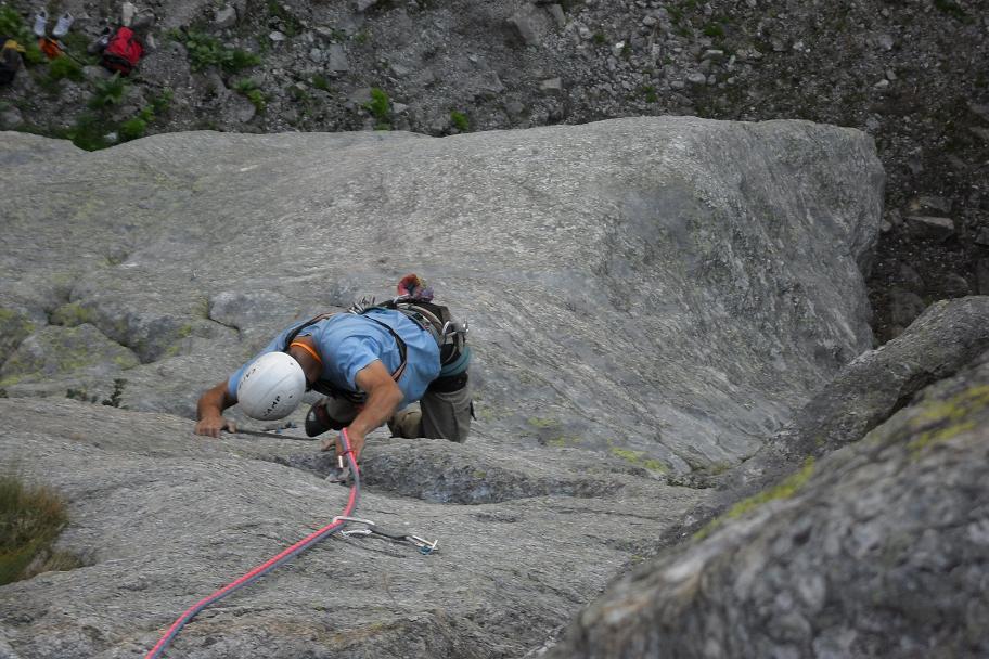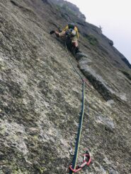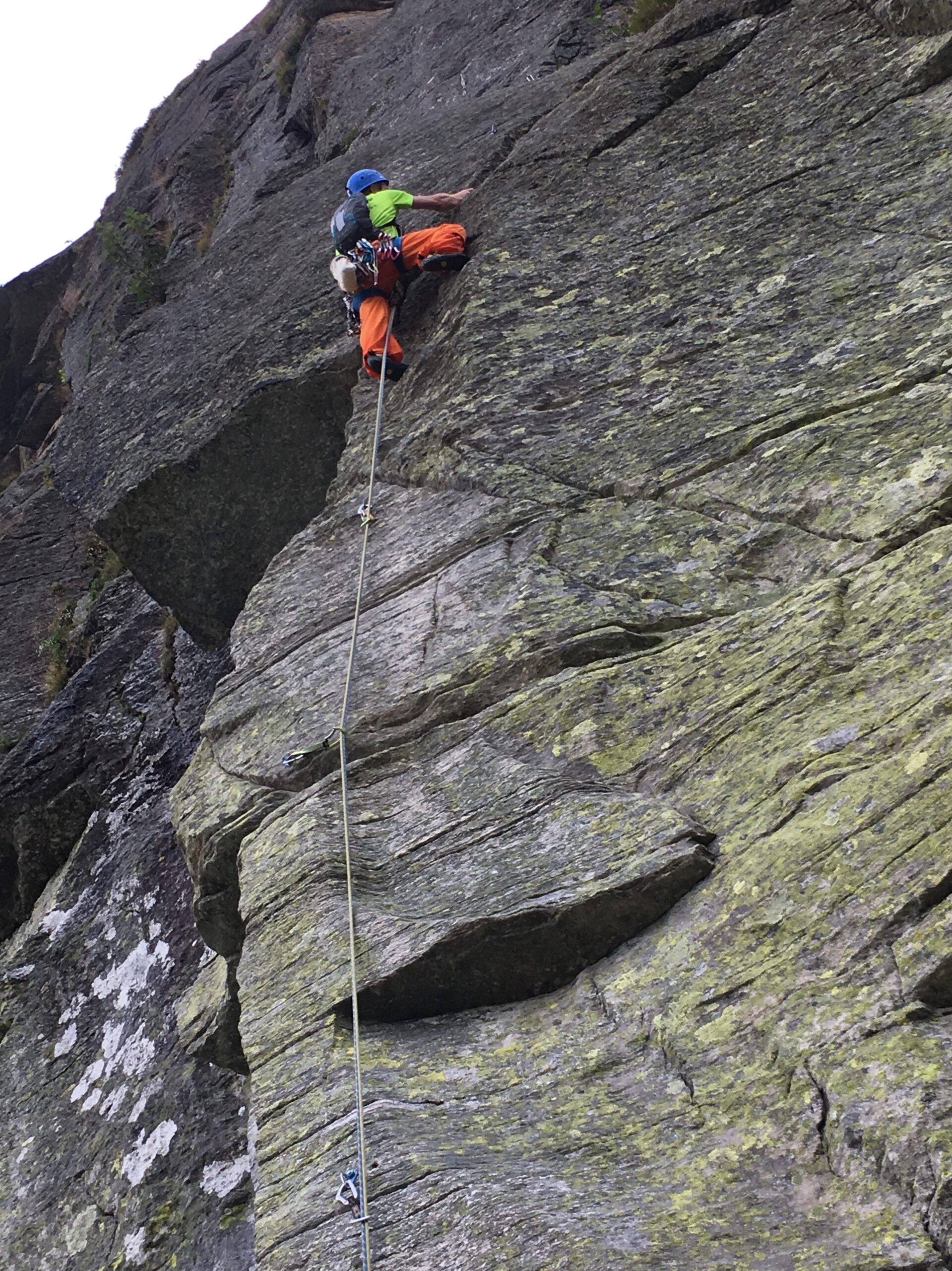 Utile qualche nut/friend per L3 (l'attacco del tiro è abbastanza esposto sul sottostante camino) e per L6 (fessura che in condizioni di forte umidità risulta sfuggente).